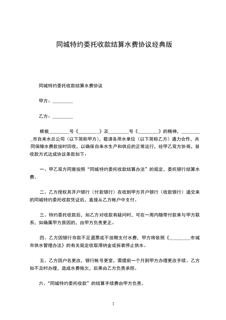 根据_________号《_________》及_________号《_________》的精神,_________市自来水总公司(以下简称甲方),敬请各用水单位(以下简称乙方)通力合作,共同保障水费款按时回收,以确保自来水生产和供应的正常运行,经甲乙双方协商,就收款方式达成协议条款如下: