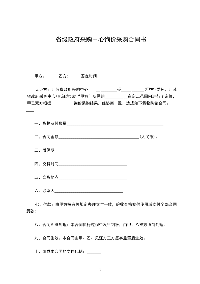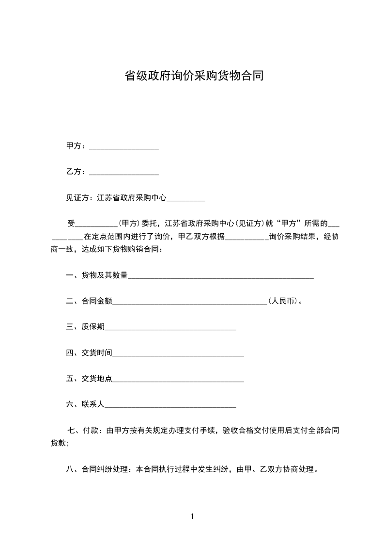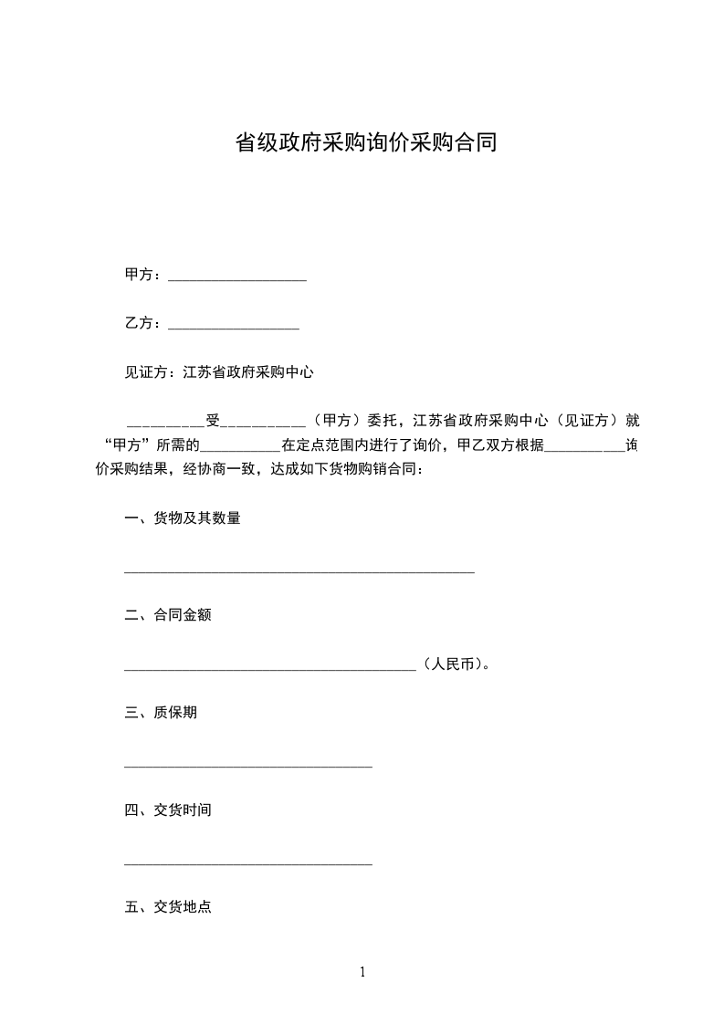 __________受___________(甲方)委托,江苏省政府采购中心(见证方)就“甲方”所需的___________在定点范围内进行了询价,甲乙双方根据___________询价采购结果,经协商一致,达成如下货物购销合同: