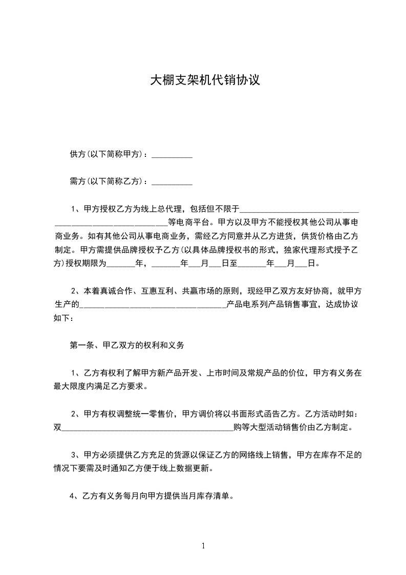 2、本着真诚合作、互惠互利、共赢市场的原则,现经甲乙双方友好协商,就甲方生产的___________________________________产品电系列产品销售事宜,达成协议如下: