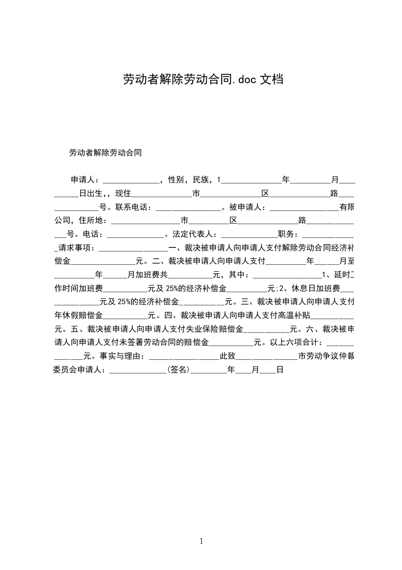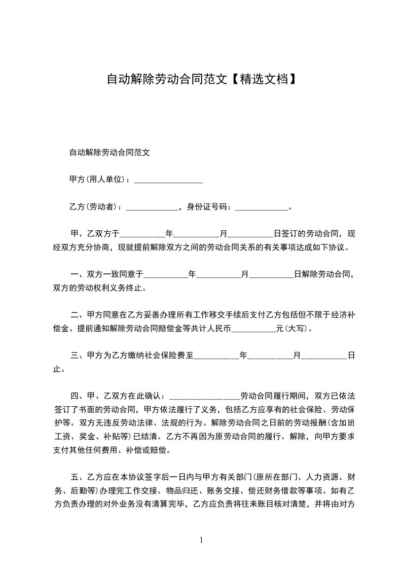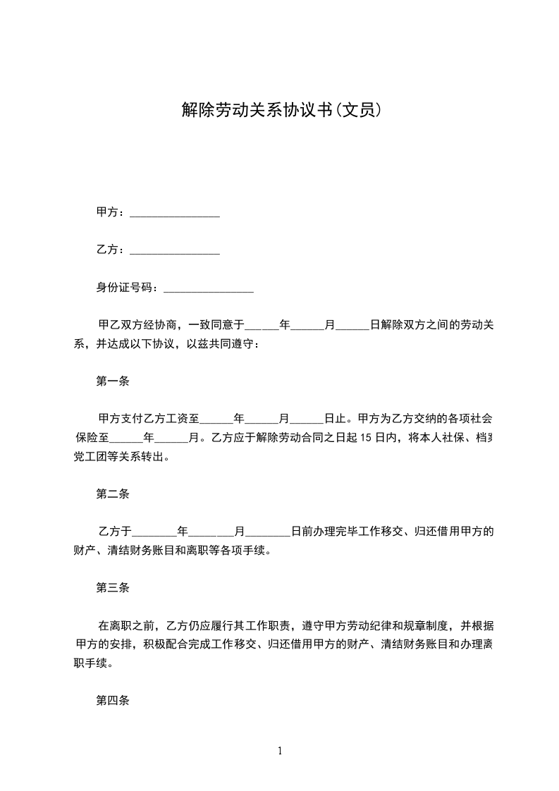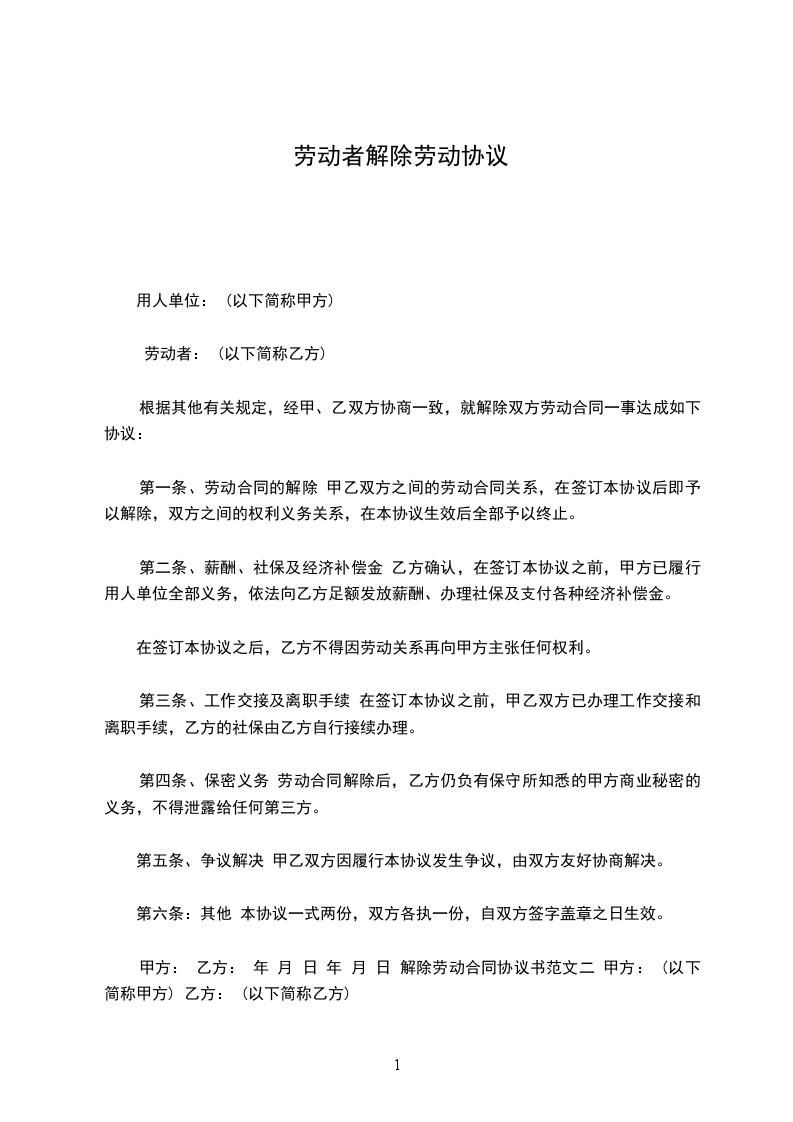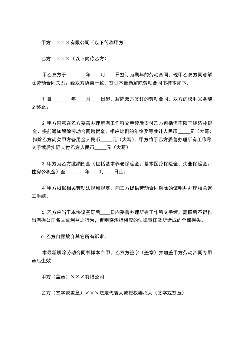 1.自________年____月____日起,解除双方签订的劳动合同,双方的权利义务随之终止;