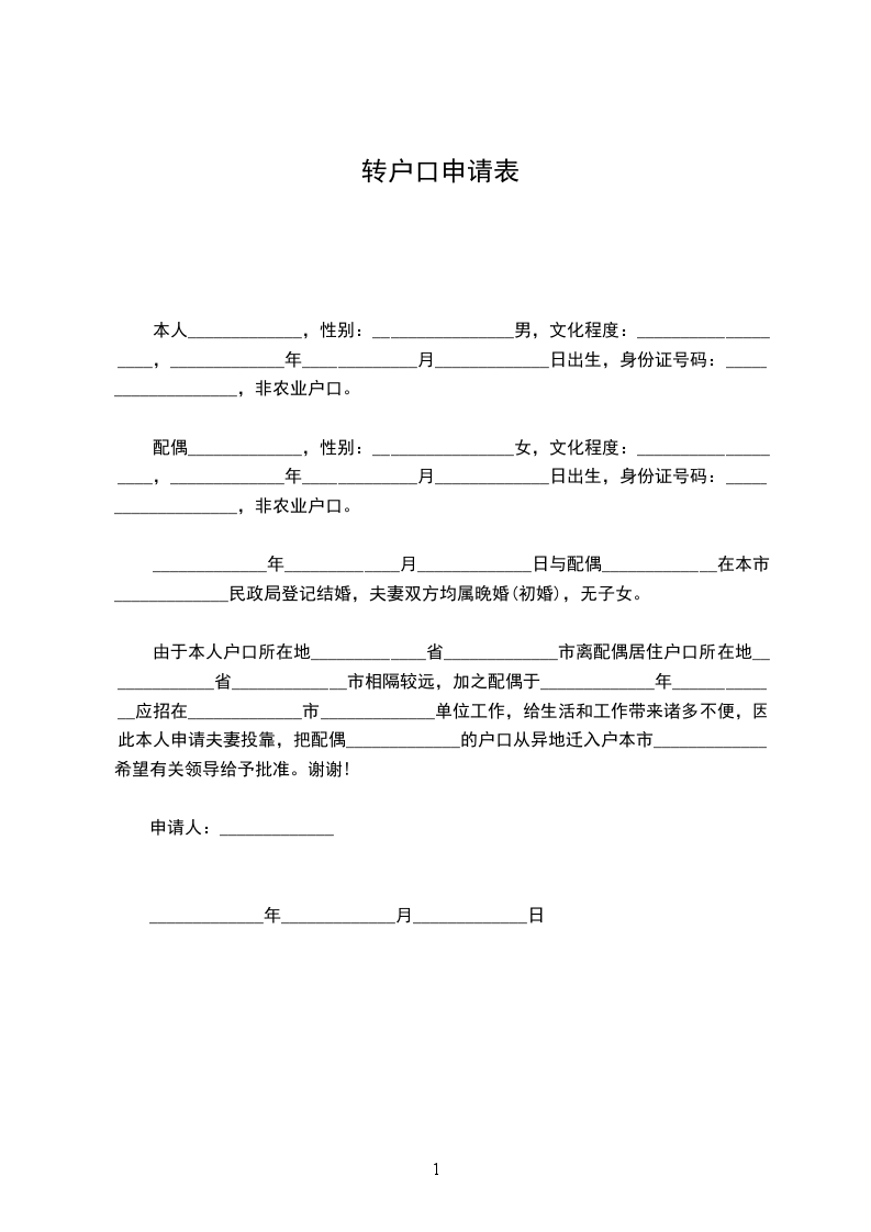 由于本人户口所在地_____________省_____________市离配偶居住户口所在地_____________省_____________市相隔较远,加之配偶于_____________年_____________应招在_____________市_____________单位工作,给生活和工作带来诸多不便,因此本人申请夫妻投靠,把配偶_____________的户口从异地迁入户本市_____________,希望有关领导给予批准。谢谢!