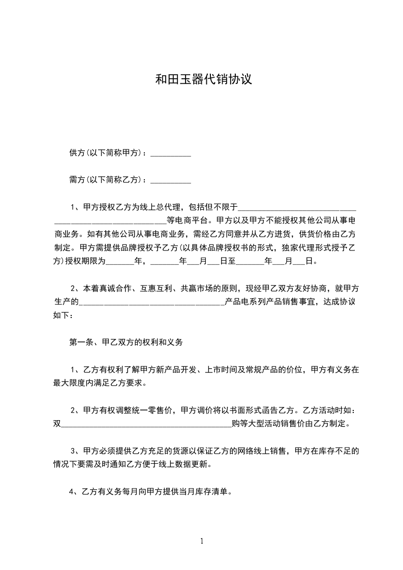 1、甲方授权乙方为线上总代理,包括但不限于________________________________________________________等电商平台。甲方以及甲方不能授权其他公司从事电商业务。如有其他公司从事电商业务,需经乙方同意并从乙方进货,供货价格由乙方制定。甲方需提供品牌授权予乙方(以具体品牌授权书的形式,独家代理形式授予乙方)授权期限为_______年,_______年___月___日至_______年___月___日。