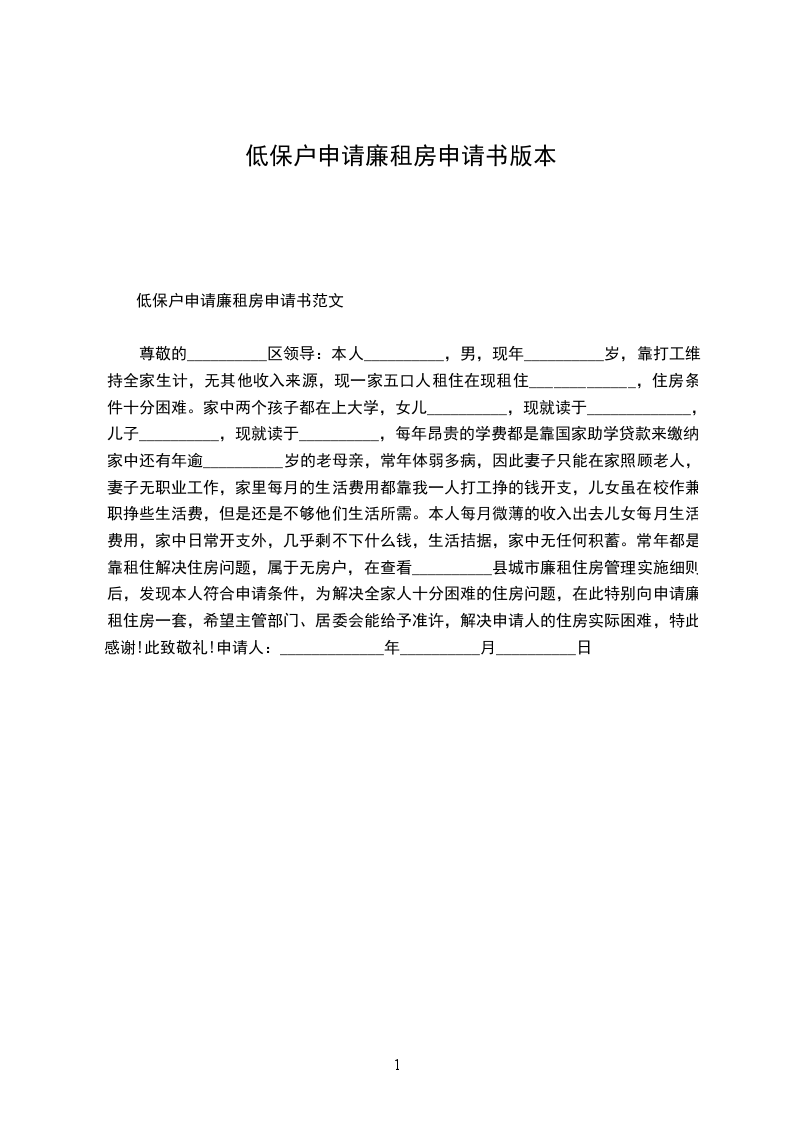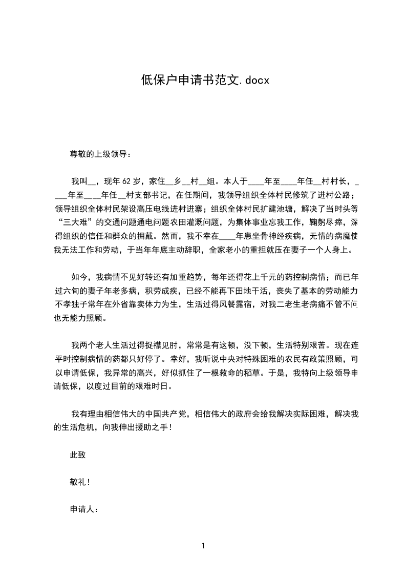 我叫_______________,性别___________(男、女),_____________年_____月__________日出生,___________族,身份证号码________________;妻子_______________,女,_____________年_____月__________日出生,___________族,身份证号码________________,本家庭户籍为__________市(县)__________镇(乡),现常住__________市__________镇(乡)_____村(居)_____组。现因______________(导致生活困难原因)。目前家庭月(年)收入仅__________元,致使家庭异常困难,月(年)收入还不能维持基本生活,生活十分拮据。为此,需申请(城市)农村最低生活保障待遇,以解决目前基本生活遇到的困,望批准!!