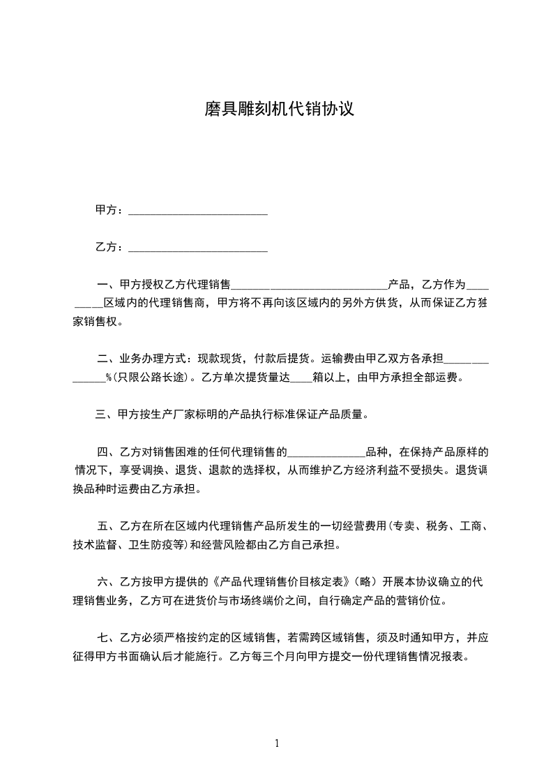 一、甲方授权乙方代理销售____________________________产品,乙方作为_________区域内的代理销售商,甲方将不再向该区域内的另外方供货,从而保证乙方独家销售权。