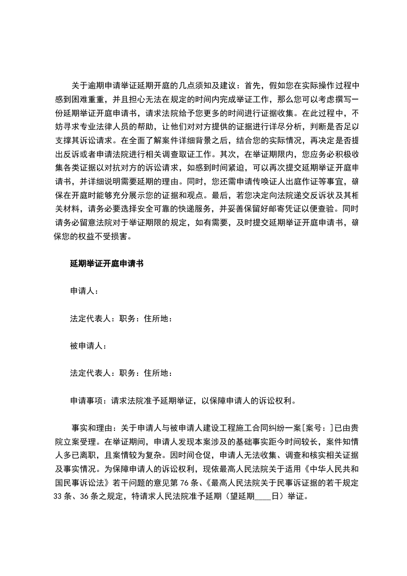 事实和理由:_________________关于申请人与被申请人建设工程施工合同纠纷一案[案号:_________________]已由贵院立案受理。在举证期间,申请人发现本案涉及的基础事实距今时间较长,案件知情人多已离职,且案情较为复杂。因时间仓促,申请人无法收集、调查和核实相关证据及事实情况。为保障申请人的诉讼权利,现依最高人民法院关于适用《中华人民共和国民事诉讼法》若干问题的意见第76条、《最高人民法院关于民事诉证据的若干规定》33条、36条之规定,特请求人民法院准予延期(望延期30日)举证。