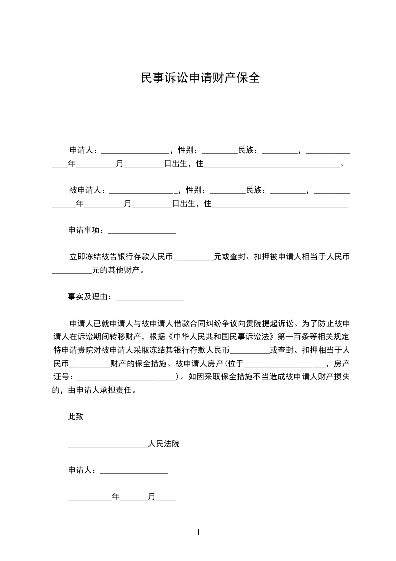申请人已就申请人与被申请人借款合同纠纷争议向贵院提起诉讼。为了防止被申请人在诉讼期间转移财产,根据《中华人民共和国民事诉讼法》第一百条等相关规定,特申请贵院对被申请人采取冻结其银行存款人民币__________或查封、扣押相当于人民币__________财产的保全措施。被申请人房产(位于____________________,房产证号:________________________)。如因采取保全措施不当造成被申请人财产损失的,由申请人承担责任。