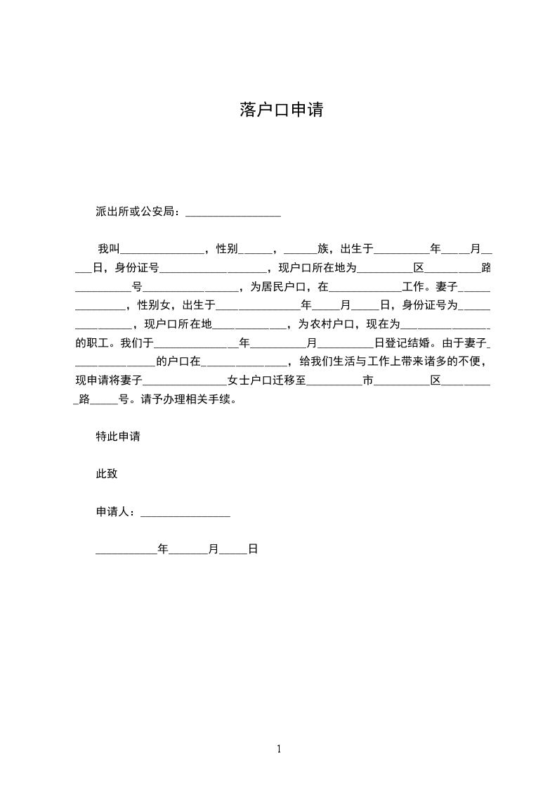 我叫_______________,性别______,______族,出生于__________年_____月_____日,身份证号___________________,现户口所在地为__________区__________路__________号_________________,为居民户口,在_____________工作。妻子_______________,性别女,出生于_______________年_____月_____日,身份证号为________________,现户口所在地_____________,为农村户口,现在为________________的职工。我们于_______________年__________月__________日登记结婚。由于妻子_______________的户口在_______________,给我们生活与工作上带来诸多的不便,现申请将妻子_______________女士户口迁移至__________市__________区__________路_____号。请予办理相关手续。