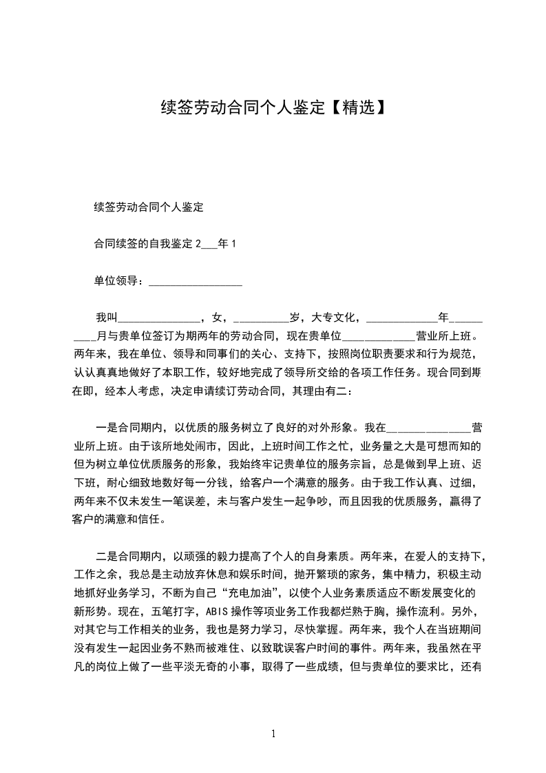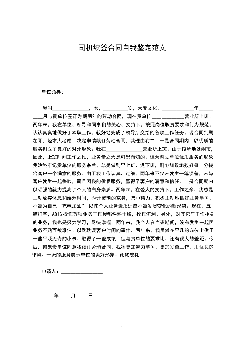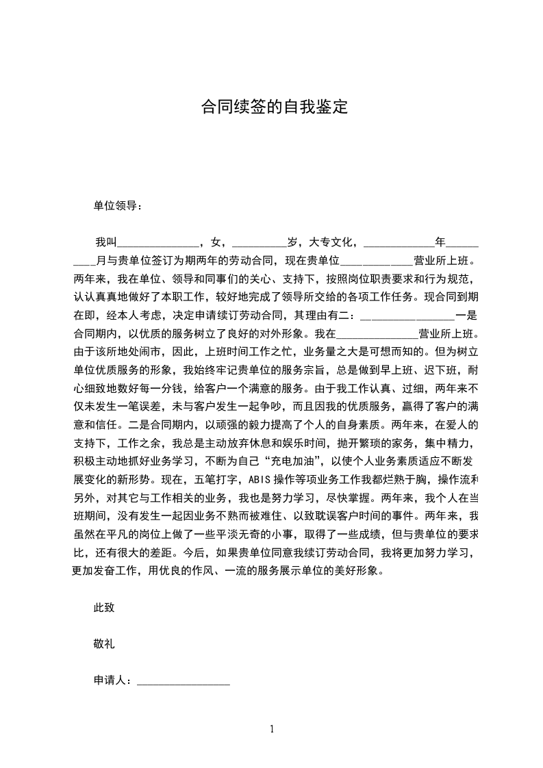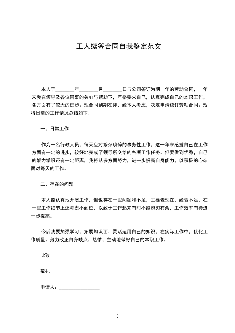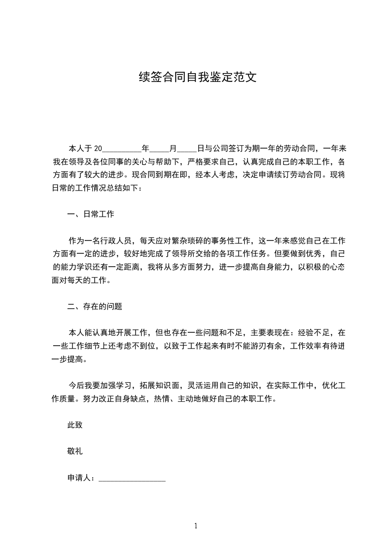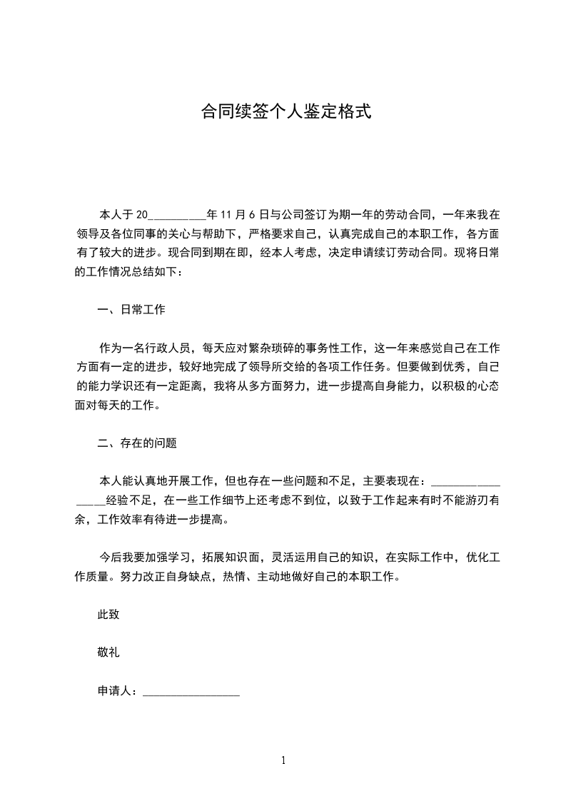 本人于20__________年11月6日与公司签订为期一年的劳动合同,一年来我在领导及各位同事的关心与帮助下,严格要求自己,认真完成自己的本职工作,各方面有了较大的进步。现合同到期在即,经本人考虑,决定申请续订劳动合同。现将日常的工作情况总结如下: