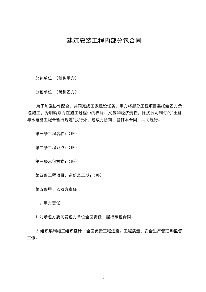 为了加强协作配合,共同完成国家建设任务,甲方将部分工程项目委托给乙方承包施工,为明确双方在施工过程中的权利、义务和经济责任,除按公司制订的"土建与水电施工配合暂行规定"执行外,经双方协商,签订本合同,共同履行。