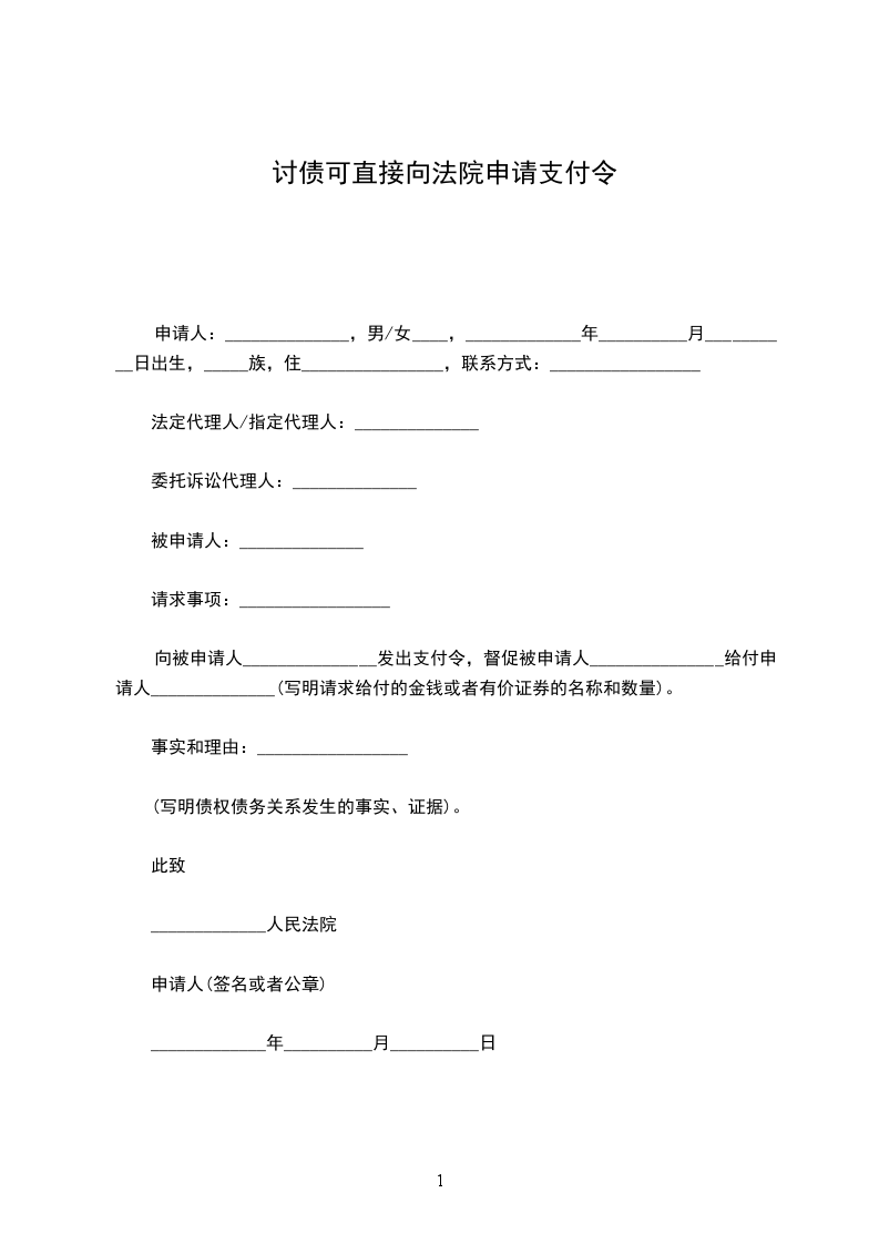 向被申请人_______________发出支付令,督促被申请人_______________给付申请人______________(写明请求给付的金钱或者有价证券的名称和数量)。