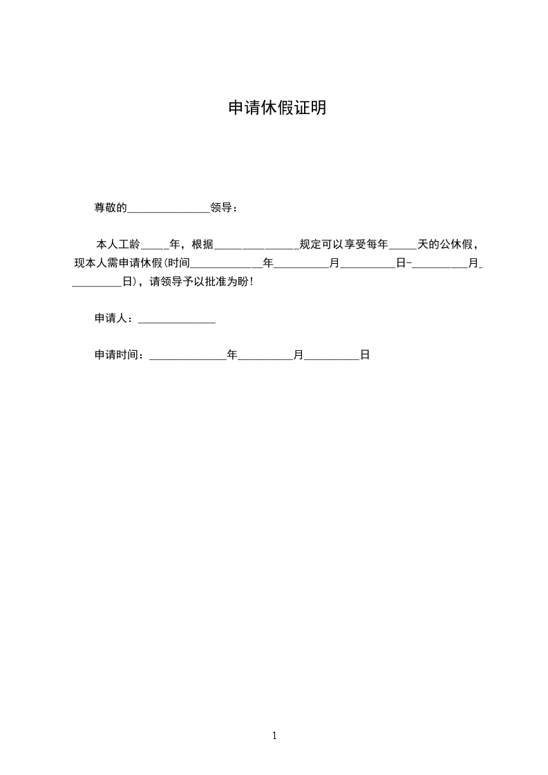 本人工龄_____年,根据_______________规定可以享受每年_____天的公休假,现本人需申请休假(时间_____________年__________月__________日-__________月__________日),请领导予以批准为盼!