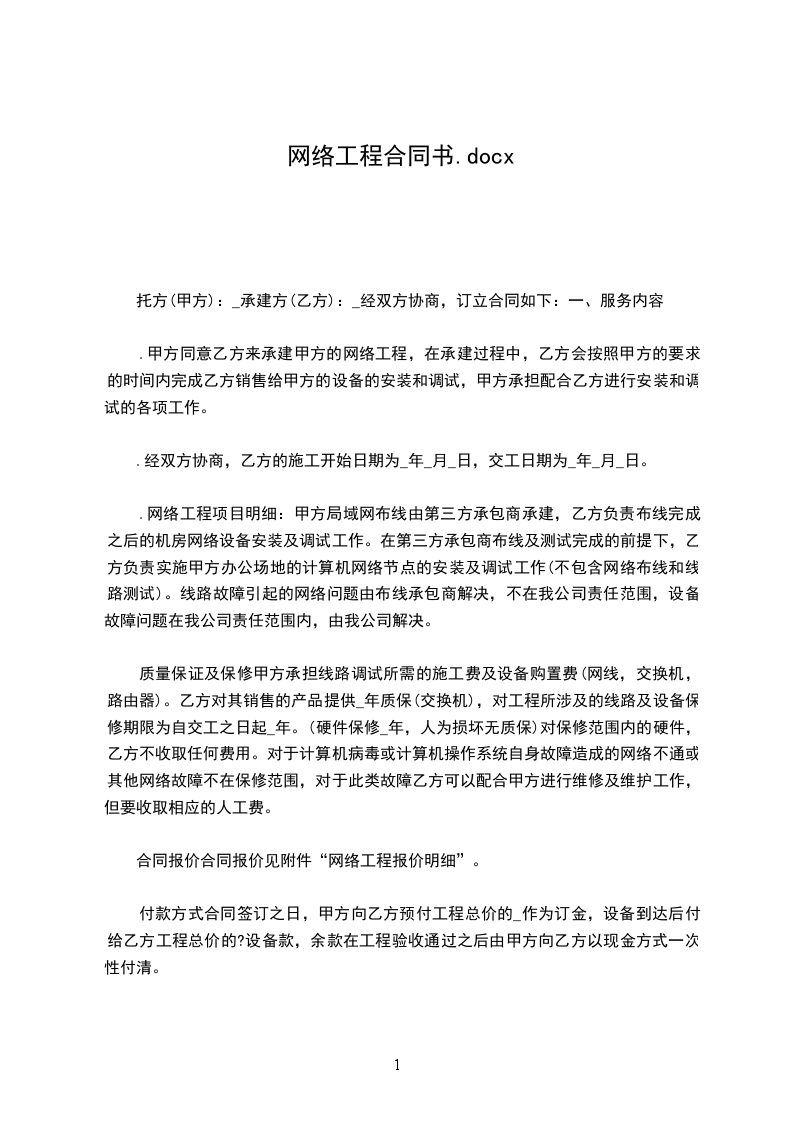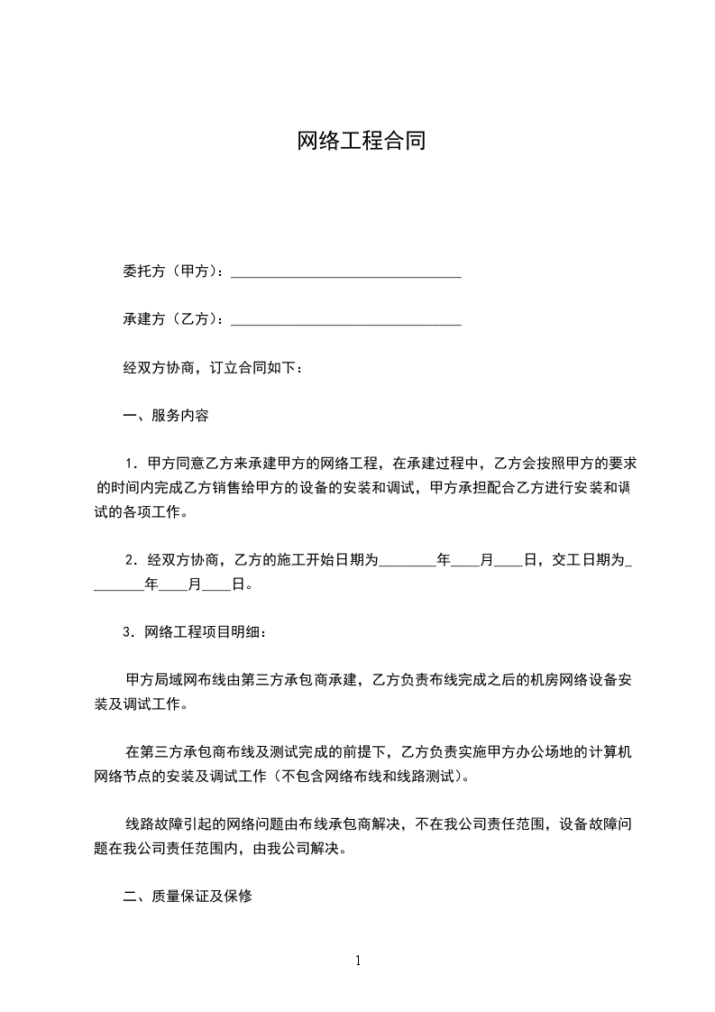 1.甲方同意乙方来承建甲方的网络工程,在承建过程中,乙方会按照甲方的要求的时间内完成乙方销售给甲方的设备的安装和调试,甲方承担配合乙方进行安装和调试的各项工作。