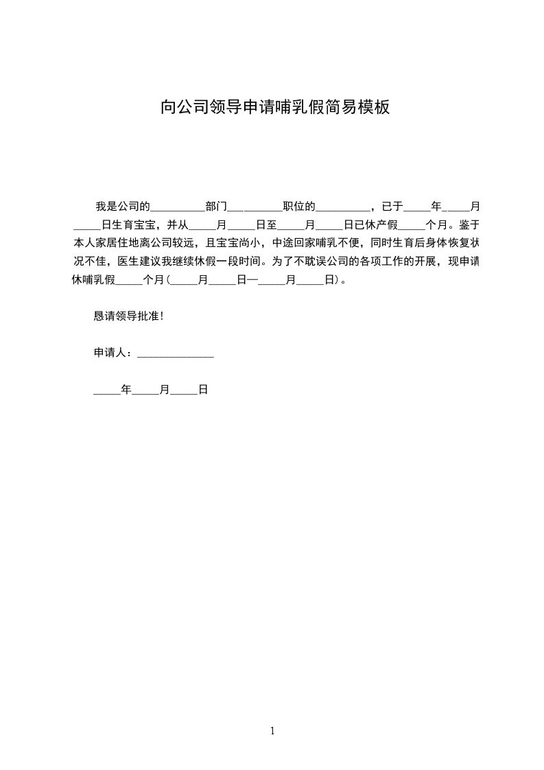 我是公司的__________部门__________职位的__________,已于_____年_____月_____日生育宝宝,并从_____月_____日至_____月_____日已休产假_____个月。鉴于本人家居住地离公司较远,且宝宝尚小,中途回家哺乳不便,同时生育后身体恢复状况不佳,医生建议我继续休假一段时间。为了不耽误公司的各项工作的开展,现申请休哺乳假_____个月(_____月_____日—_____月_____日)。