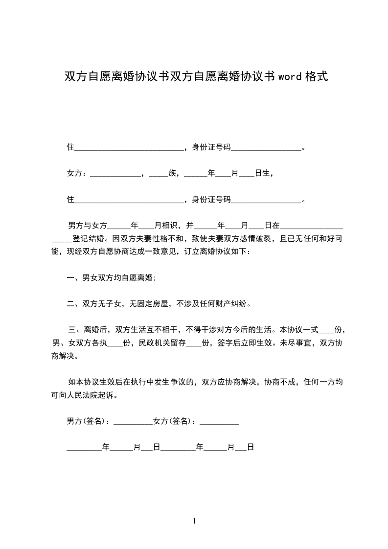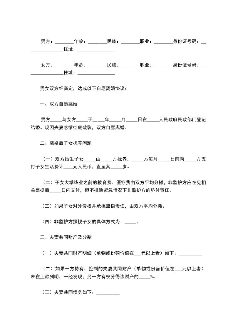 女方:________年龄:________民族:________职业:________身份证号码:________________住址:________________