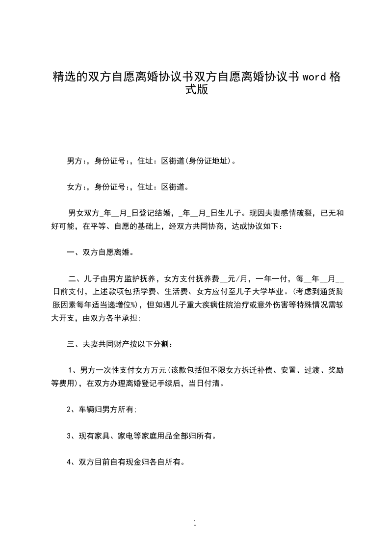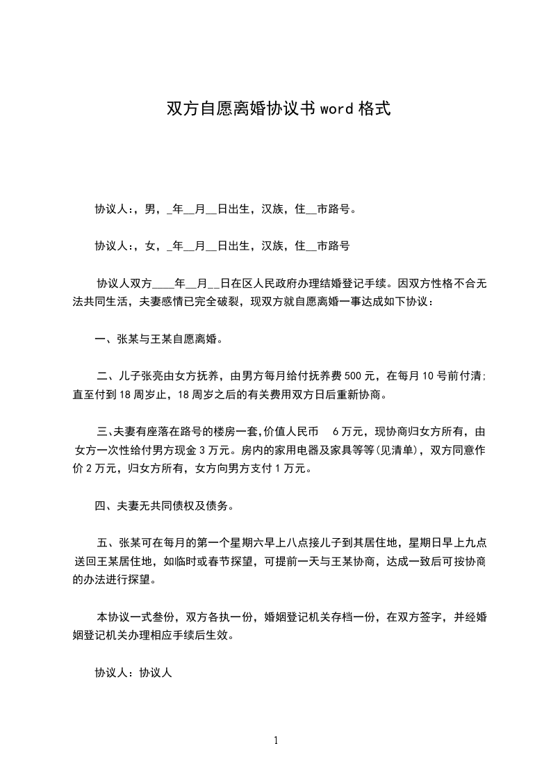 男女双方经商定,达成以下自愿离婚协议: