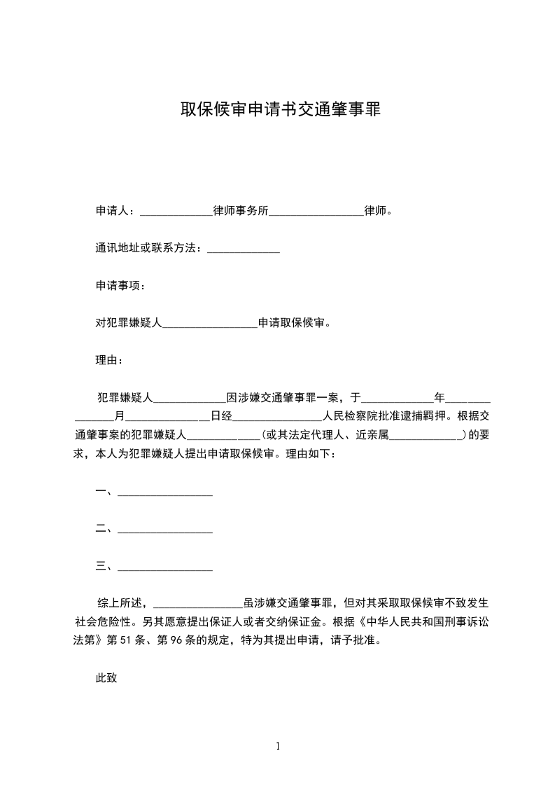 犯罪嫌疑人_____________因涉嫌交通肇事罪一案,于_____________年_______________月_______________日经________________人民检察院批准逮捕羁押。根据交通肇事案的犯罪嫌疑人_____________(或其法定代理人、近亲属_____________)的要求,本人为犯罪嫌疑人提出申请取保候审。理由如下: