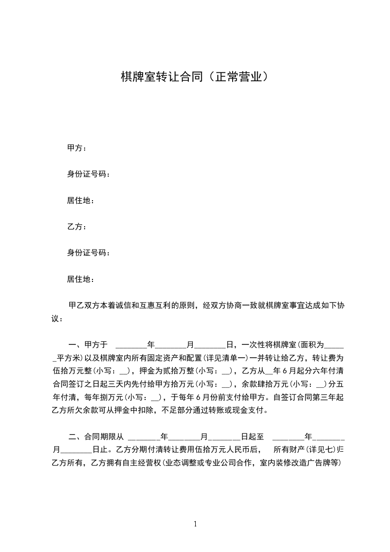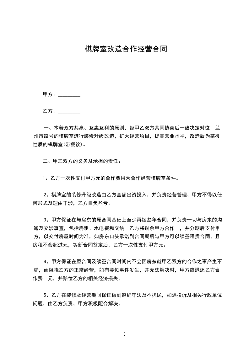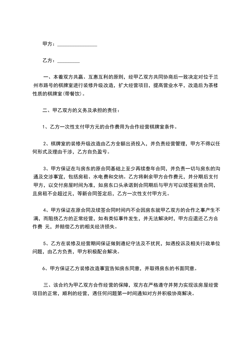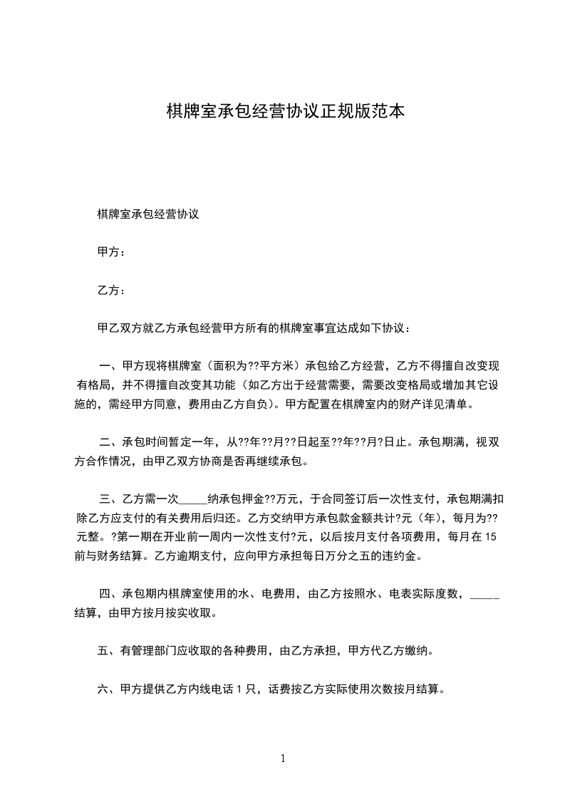 一、甲方现将棋牌室(面积为??平方米)承包给乙方经营,乙方不得擅自改变现有格局,并不得擅自改变其功能(如乙方出于经营需要,需要改变格局或增加其它设施的,需经甲方同意,费用由乙方自负)。甲方配置在棋牌室内的财产详见清单。