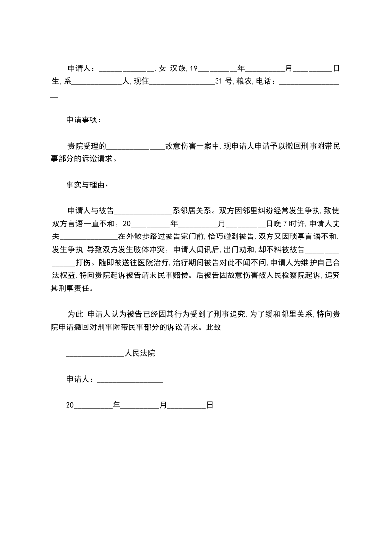 贵院受理的_______________故意伤害一案中,现申请人申请予以撤回刑事附带民事部分的诉讼请求。