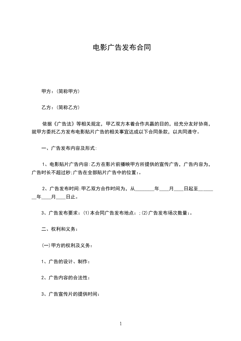 1、电影贴片广告内容:乙方在影片前播映甲方所提供的宣传广告,广告内容为,广告时长不超过秒;广告在全部贴片广告中的位置:。