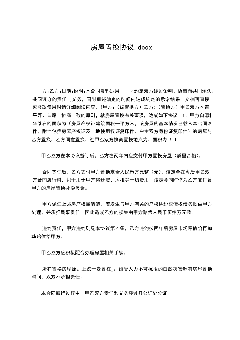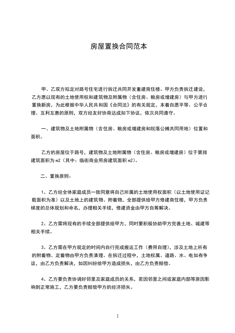 1、甲方的新建楼建成竣工后____日内给乙方置换面向xxx路的商业用房一套,层m2,住宅用房一套m2(各含公摊面积)。
