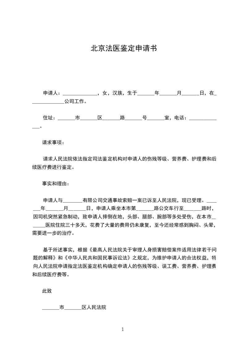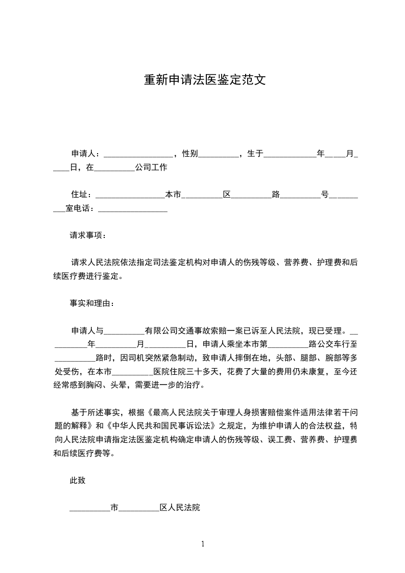 基于所述事实,根据《最高人民法院关于审理人身损害赔偿案件适用法律若干问题的解释》和《中华人民共和国民事诉讼法》之规定,为维护申请人的合法权益,特向人民法院申请指定法医鉴定机构确定申请人的伤残等级、误工费、营养费、护理费和后续医疗费等。