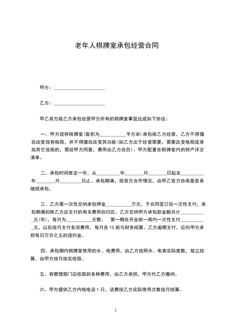 一、甲方现将棋牌室(面积为??平方米)承包给乙方经营,乙方不得擅自改变现有格局,并不得擅自改变其功能(如乙方出于经营需要,需要改变格局或增加其它设施的,需经甲方同意,费用由乙方自负)。甲方配置在棋牌室内的财产详见清单。
