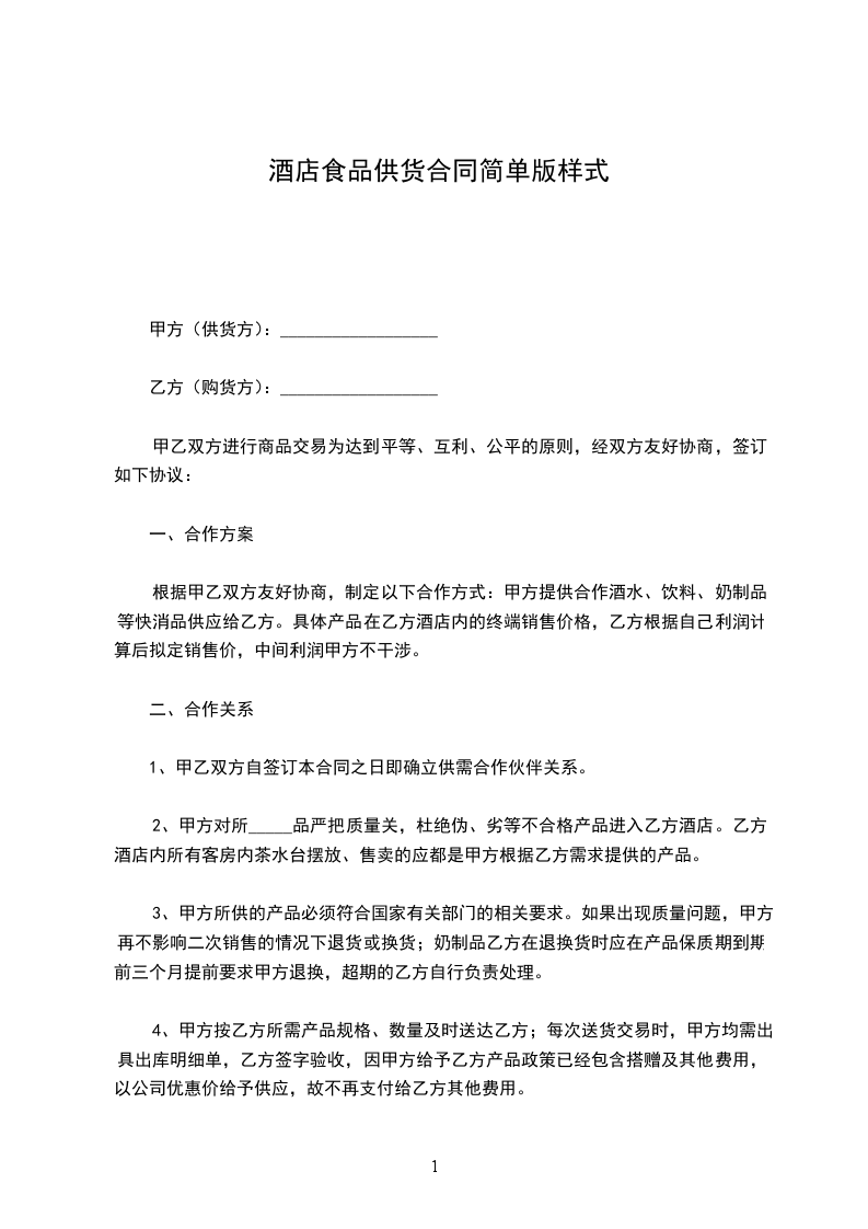 根据甲乙双方友好协商,制定以下合作方式:甲方提供合作酒水、饮料、奶制品等快消品供应给乙方。具体产品在乙方酒店内的终端销售价格,乙方根据自己利润计算后拟定销售价,中间利润甲方不干涉。