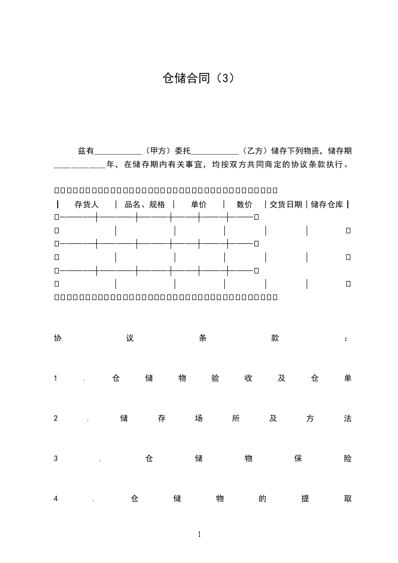 兹有______(甲方)委托______(乙方)储存下列物资,储存期______年,在储存期内有关事宜,均按双方共同商定的协议条款执行。