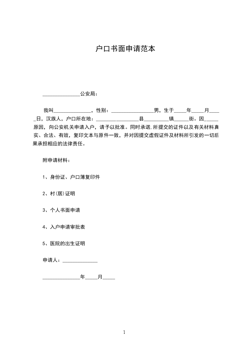 我叫_______________,性别:_________________男,生于_____年_____月_____日,汉族人,户口所在地:_________________县__________镇______街。因______原因,向公安机关申请入户,请予以批准。同时承诺,所提交的证件以及有关材料真实、合法、有效,复印文本与原件一致,并对因提交虚假证件及材料所引发的一切后果承担相应的法律责任。