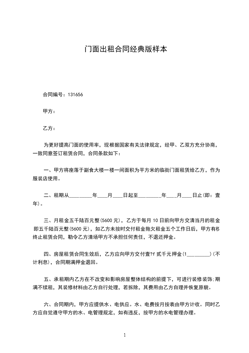 一、甲方将座落于副食大楼一楼一间面积为_____平方米的临街门面租赁给乙方,作为服装店使用。