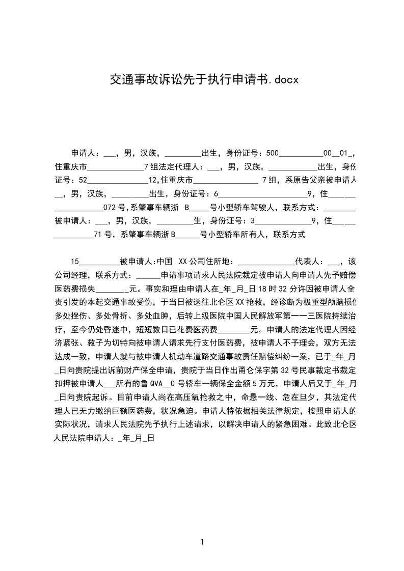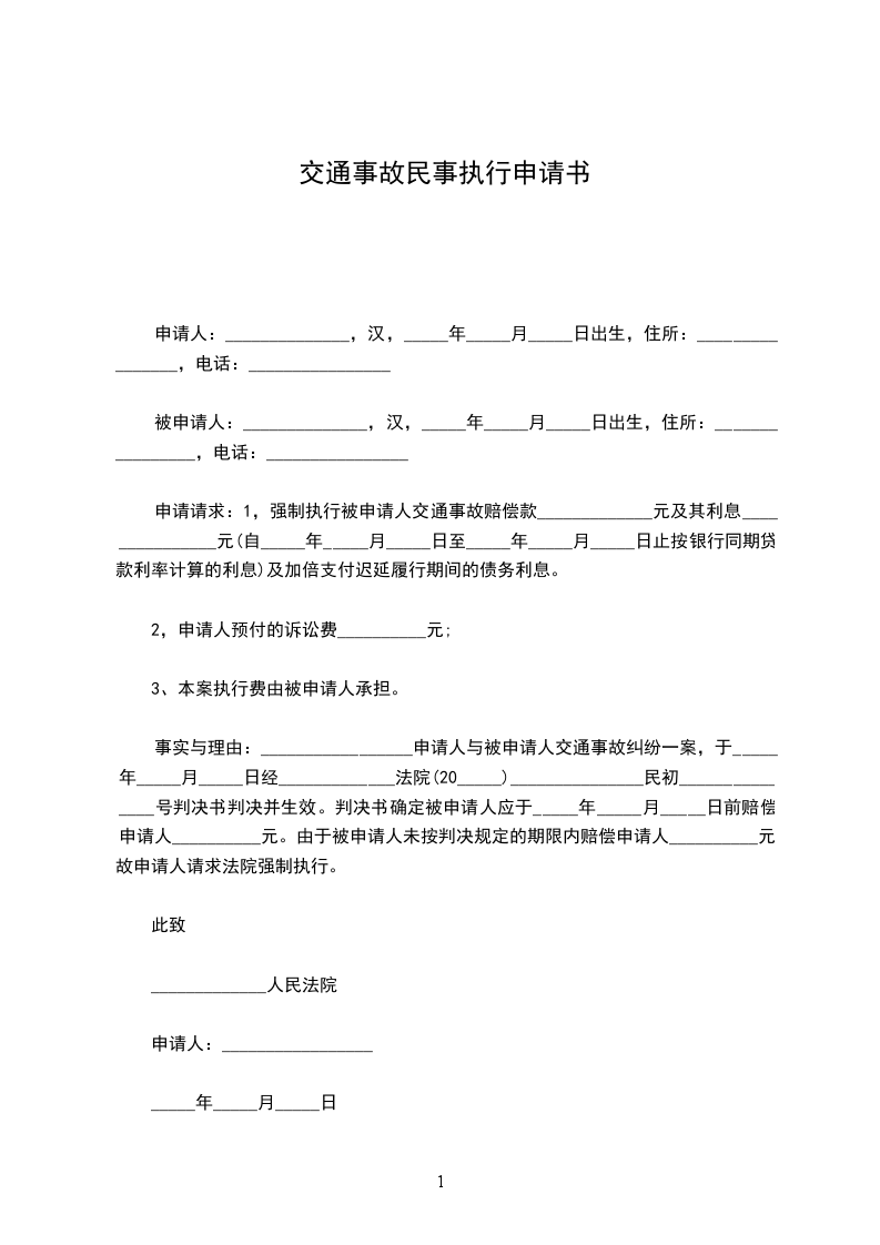 申请请求:1,强制执行被申请人交通事故赔偿款_____________元及其利息_______________元(自_____年_____月_____日至_____年_____月_____日止按银行同期贷款利率计算的利息)及加倍支付迟延履行期间的债务利息。