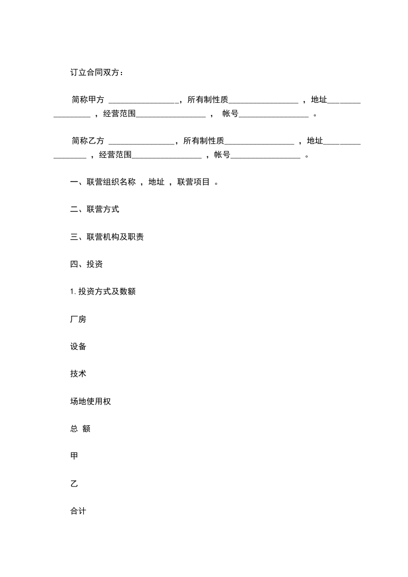 2.联营企业名称:____市(县)____公司地址:____隶属:____经济性质____(所有制)联营。核算方式:共同经营、统一核算、共负盈亏。