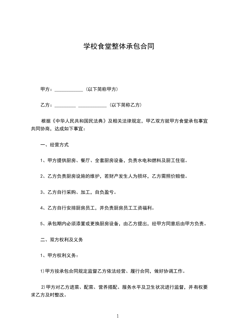1、乙方对其承包的食堂享有_____自主、自负盈亏的经营自主权。乙方应严格遵守《食品卫生法》、《环境保护法》、《学校食堂与学生集体用餐卫生管理规定》及学校的相关规定。承包期内乙方不得随意中途停止营业或不正常营业,或转包他人经营。
