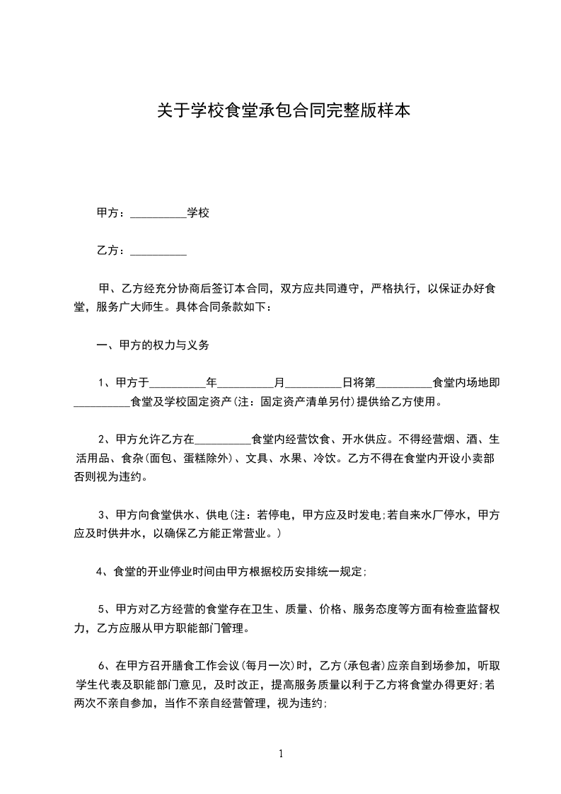 1、甲方于__________年__________月__________日将第__________食堂内场地即__________食堂及学校固定资产(注:固定资产清单另付)提供给乙方使用。