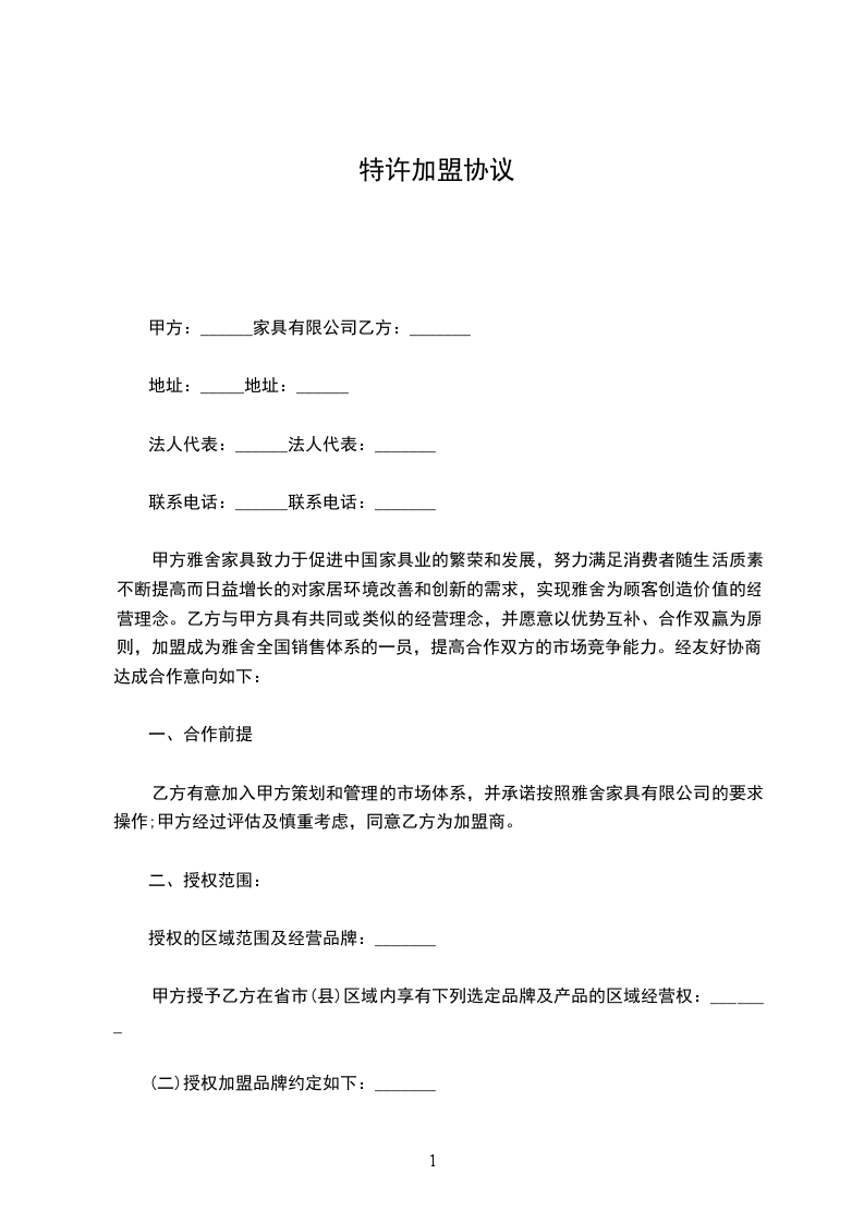 1、甲方特许乙方___________先生/女士在_______省________市/县_______区域内开设加盟店,加盟店的具体地址为。
