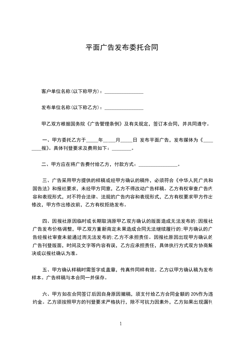 5、发布内容:发布__________品牌广告;广告内容必须符合中华人民共和国有关《广告法》及国家工商行政管理局的广告管理条例。