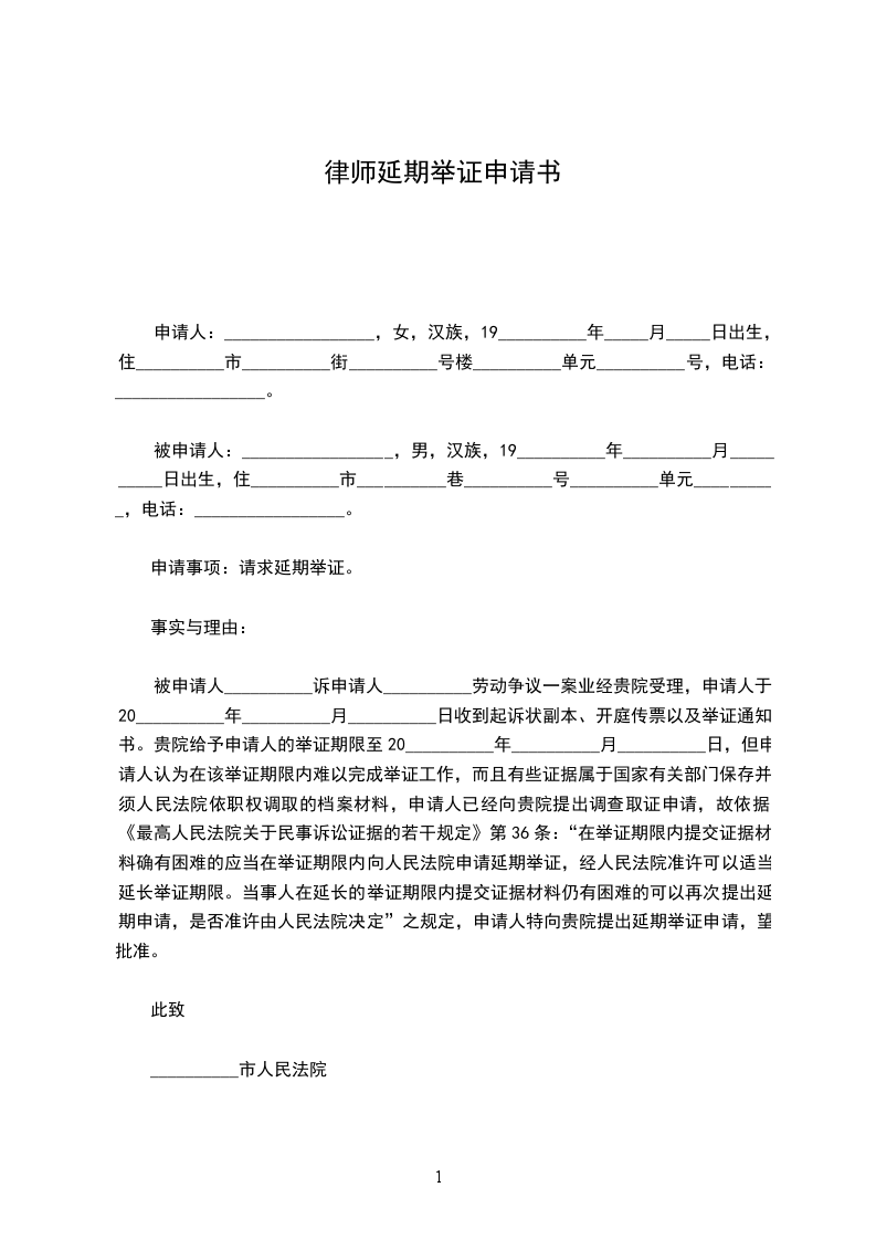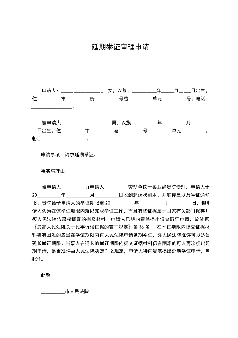 被申请人__________诉申请人__________劳动争议一案业经贵院受理,申请人于20__________年__________月__________日收到起诉状副本、开庭传票以及举证通知书。贵院给予申请人的举证期限至20__________年__________月__________日,但申请人认为在该举证期限内难以完成举证工作,而且有些证据属于国家有关部门保存并须人民法院依职权调取的档案材料,申请人已经向贵院提出调查取证申请,故依据《最高人民法院关于民事诉讼证据的若干规定》第36条:“在举证期限内提交证据材料确有困难的应当在举证期限内向人民法院申请延期举证,经人民法院准许可以适当延长举证期限。当事人在延长的举证期限内提交证据材料仍有困难的可以再次提出延期申请,是否准许由人民法院决定”之规定,申请人特向贵院提出延期举证申请,望批准。