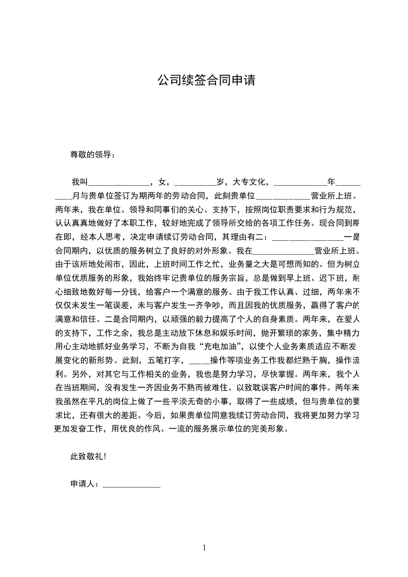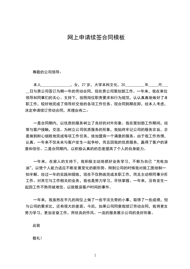 本人_______________,女,27岁,大学本科文化,20__________年_____月_____日与贵公司签订为期一年的劳动合同,现在贵公司策划部工作。一年来,我在单位、领导和同事们的关心、支持下,按照岗位职责要求和行为规范,认认真真地做好了本职工作,较好地完成了领导所交给的各项工作任务。现合同到期在即,经本人考虑,决定申请续订劳动合同,其理由有二: