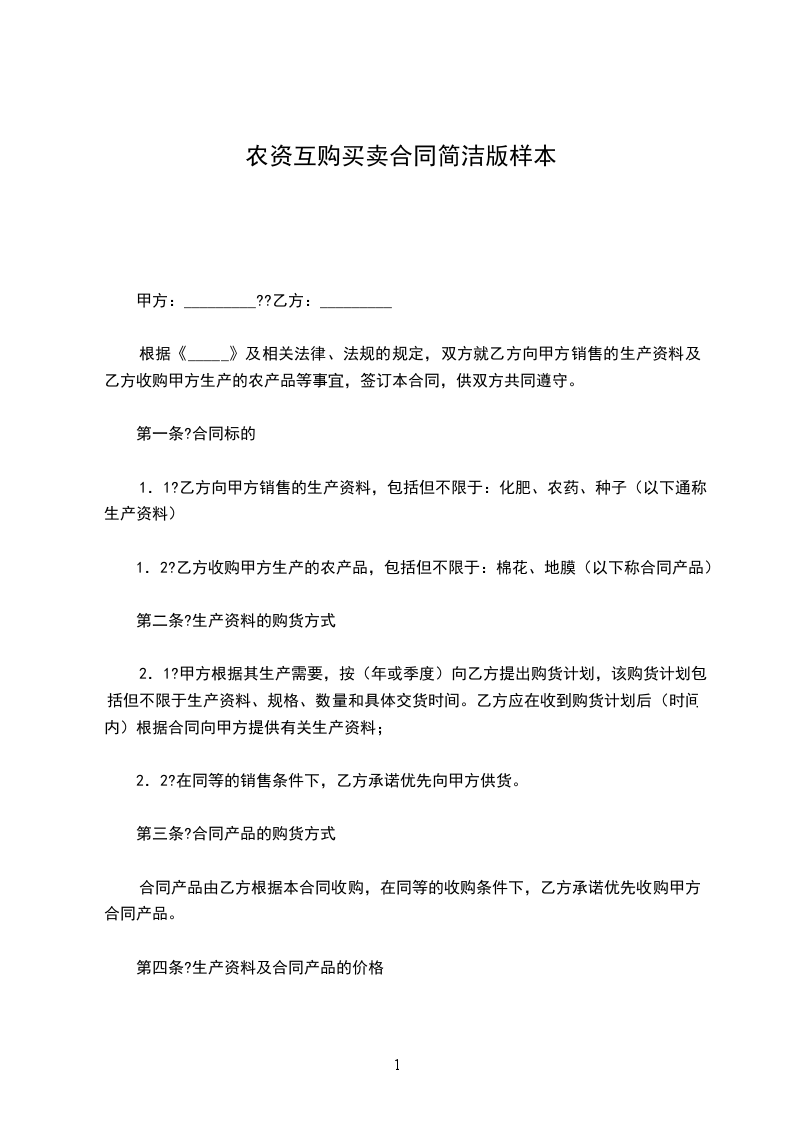 1.2?乙方收购甲方生产的农产品,包括但不限于:棉花、地膜(以下称合同产品)