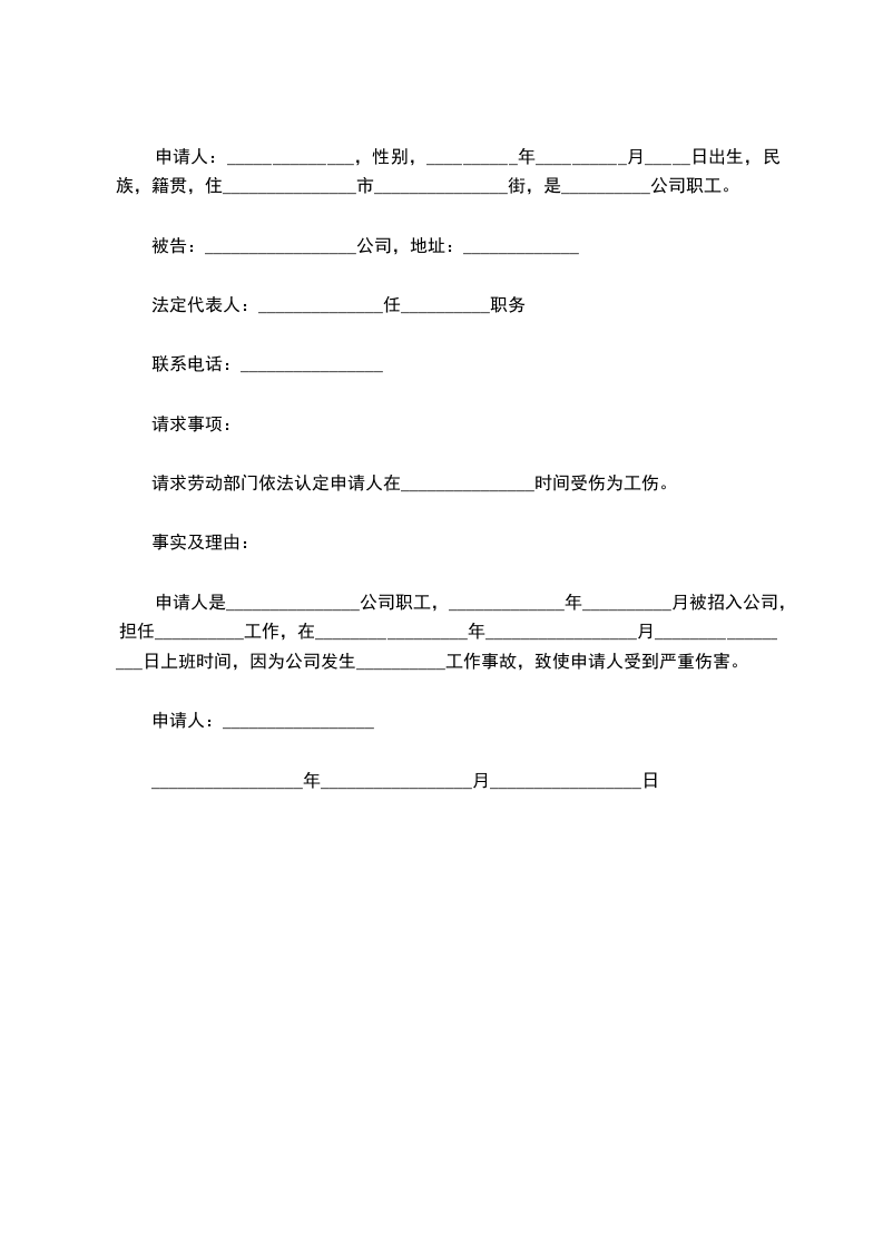 申请人是_______________公司职工,_____________年__________月被招入公司,担任__________工作,在_________________年_________________月_________________日上班时间,因为公司发生__________工作事故,致使申请人受到严重伤害。