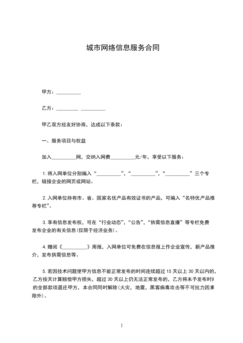 1、甲方在收到乙方支付的款项后(入网费大写:________/年),为乙方提供浏览网站(______________)_________类信息,限_______处浏览端口。服务期限从________年____月____日起至________年____月____日止。
