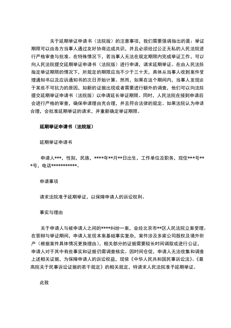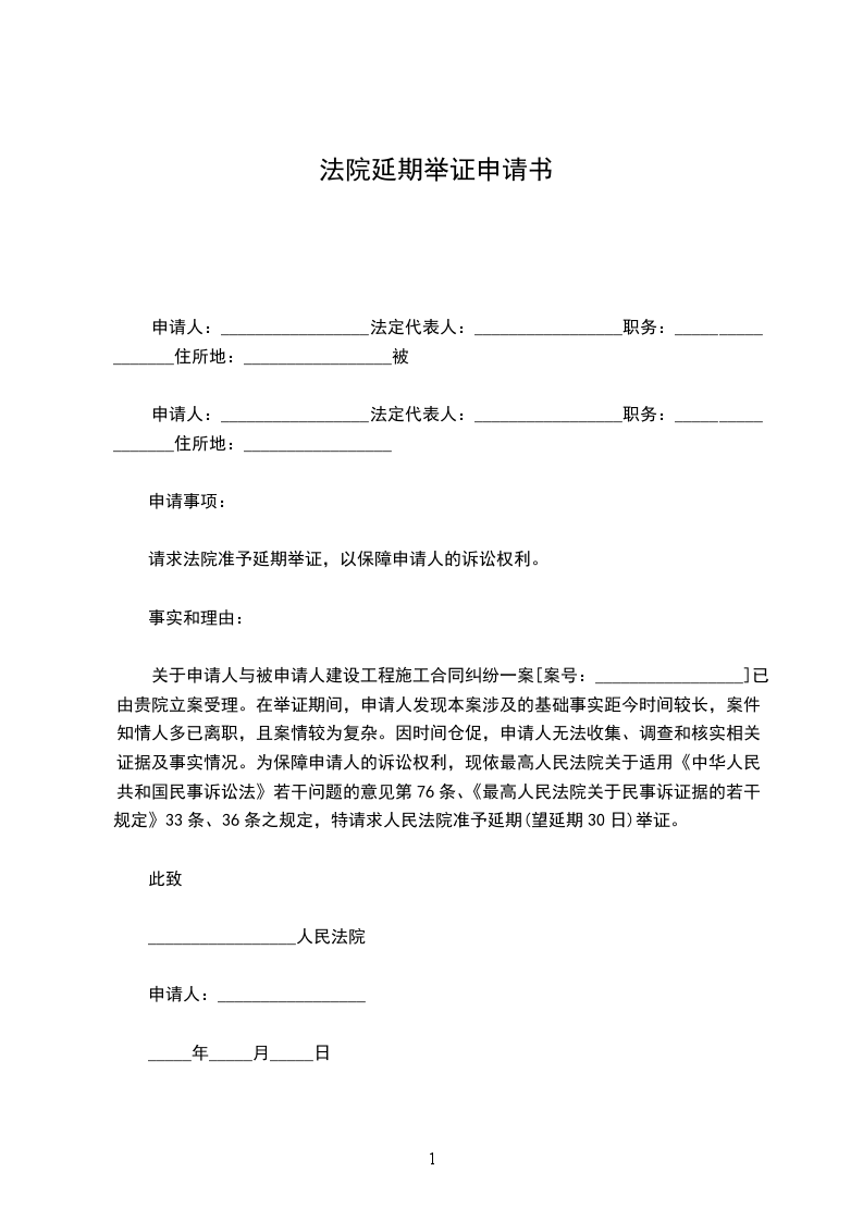 关于申请人与被申请人建设工程施工合同纠纷一案[案号:_________________]已由贵院立案受理。在举证期间,申请人发现本案涉及的基础事实距今时间较长,案件知情人多已离职,且案情较为复杂。因时间仓促,申请人无法收集、调查和核实相关证据及事实情况。为保障申请人的诉讼权利,现依最高人民法院关于适用《中华人民共和国民事诉讼法》若干问题的意见第76条、《最高人民法院关于民事诉证据的若干规定》33条、36条之规定,特请求人民法院准予延期(望延期30日)举证。