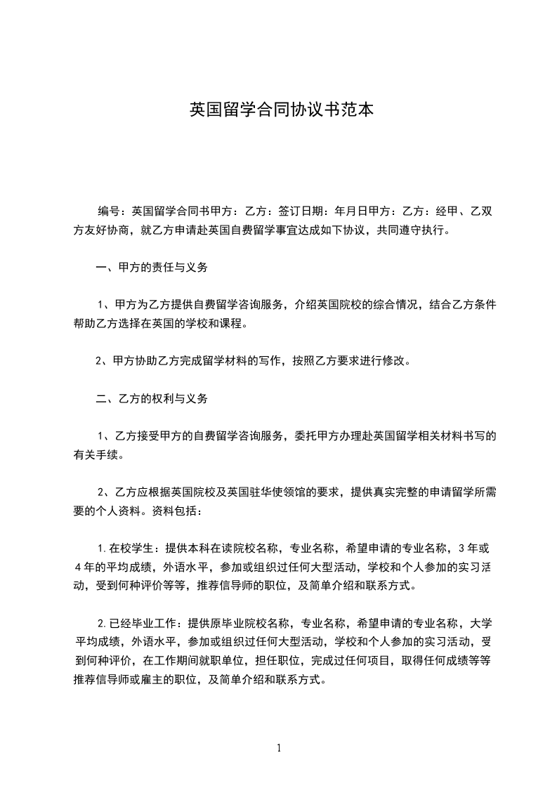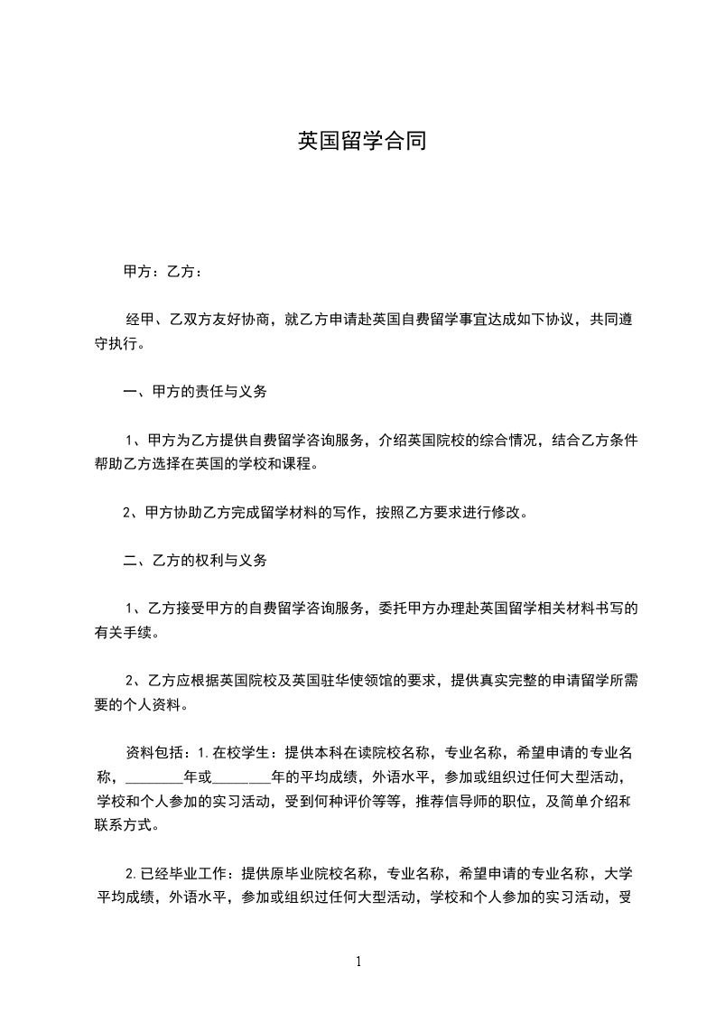 2、乙方应根据英国院校及英国驻华使领馆的要求,提供真实完整的申请留学所需要的个人资料。