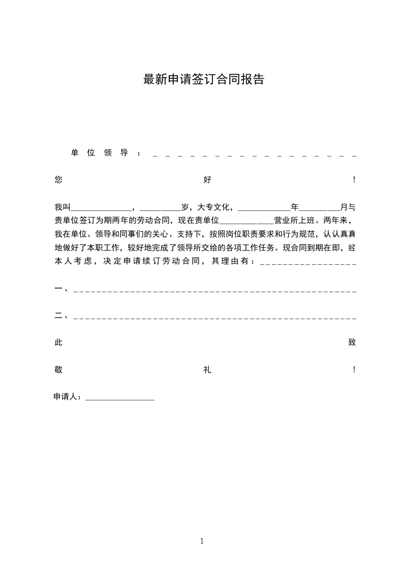 我叫_______________,__________岁,大专文化,_____________年__________月与贵单位签订为期两年的劳动合同,现在贵单位_____________营业所上班。两年来,我在单位、领导和同事们的关心、支持下,按照岗位职责要求和行为规范,认认真真地做好了本职工作,较好地完成了领导所交给的各项工作任务。现合同到期在即,经本人考虑,决定申请续订劳动合同,其理由有:_________________