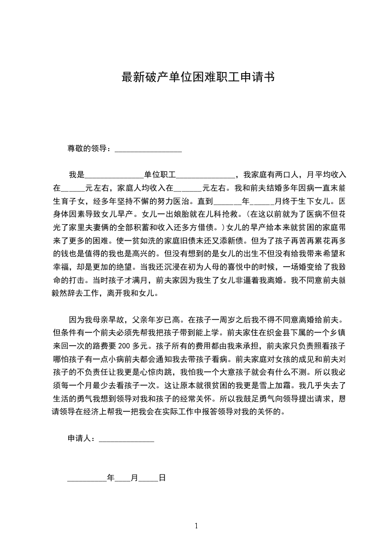 我是_______________单位职工_______________,我家庭有两口人,月平均收入在______元左右,家庭人均收入在_______元左右。我和前夫结婚多年因病一直末能生育子女,经多年坚持不懈的努力医治。直到_______年______月终于生下女儿。因身体因素导致女儿早产。女儿一出娘胎就在儿科抢救。(在这以前就为了医病不但花光了家里夫妻俩的全部积蓄和收入还多方借债。)女儿的早产给本来就贫困的家庭带来了更多的困难。使一贫如洗的家庭旧债末还又添新债。但为了孩子再苦再累花再多的钱也是值得的我也是高兴的。但没有想到的是女儿的出生不但没有给我带来希望和幸福,却是更加的绝望。当我还沉浸在初为人母的喜悦中的时候,一场婚变给了我致命的打击。当时孩子才满月,前夫家因为我生了女儿非逼着我离婚。我不同意前夫就毅然辞去工作,离开我和女儿。