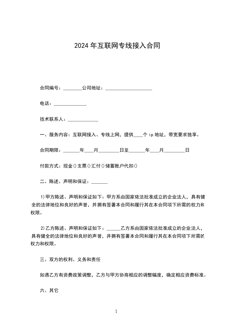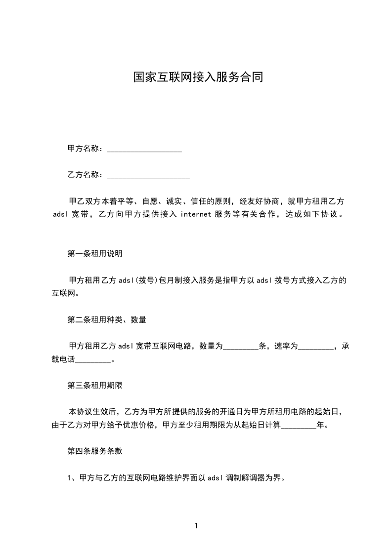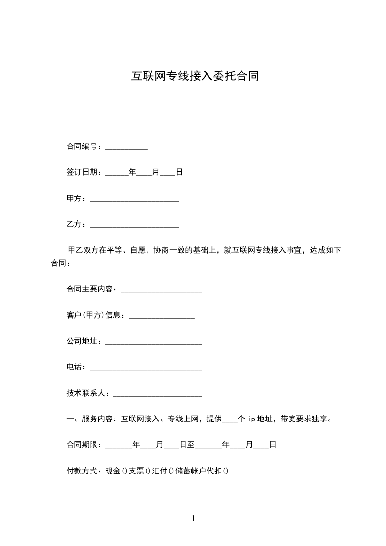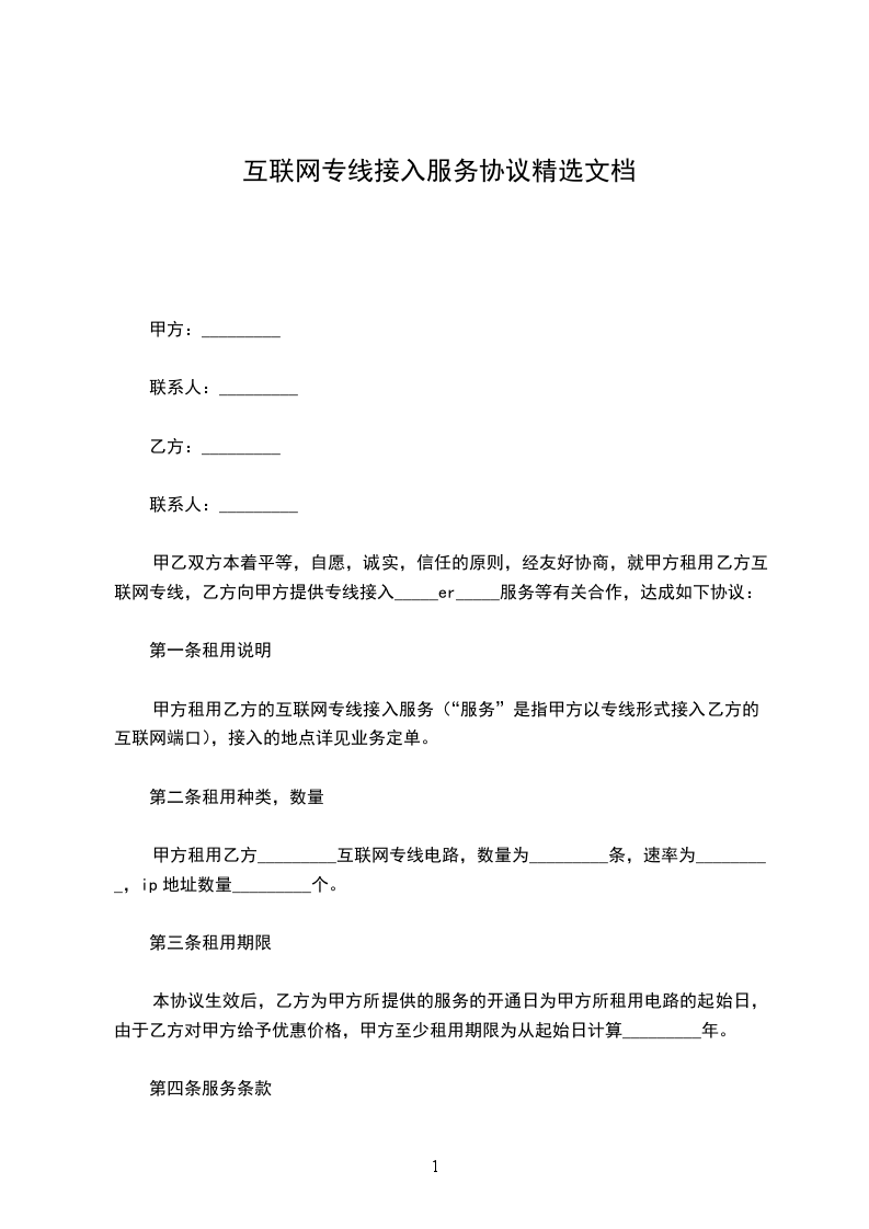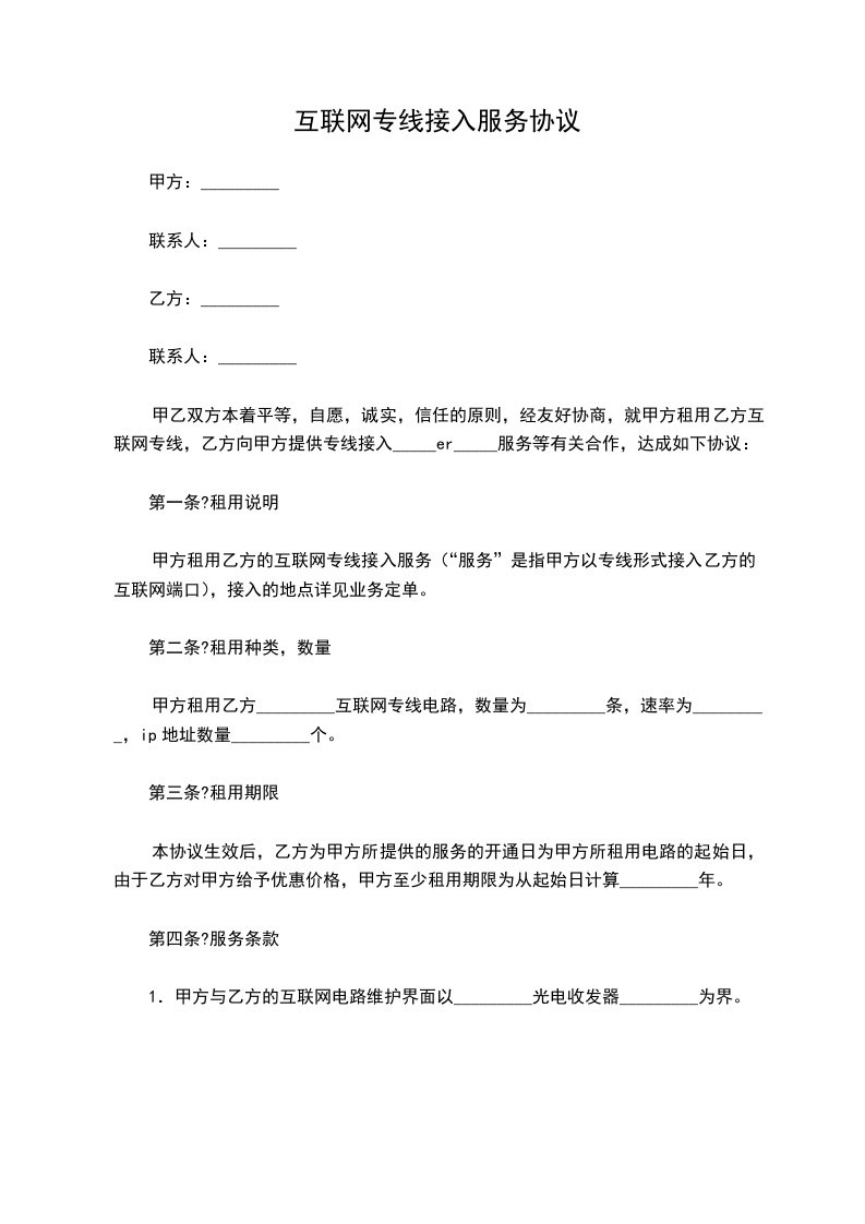 甲乙双方本着平等,自愿,诚实,信任的原则,经友好协商,就甲方租用乙方互联网专线,乙方向甲方提供专线接入_____er_____服务等有关合作,达成如下协议:
