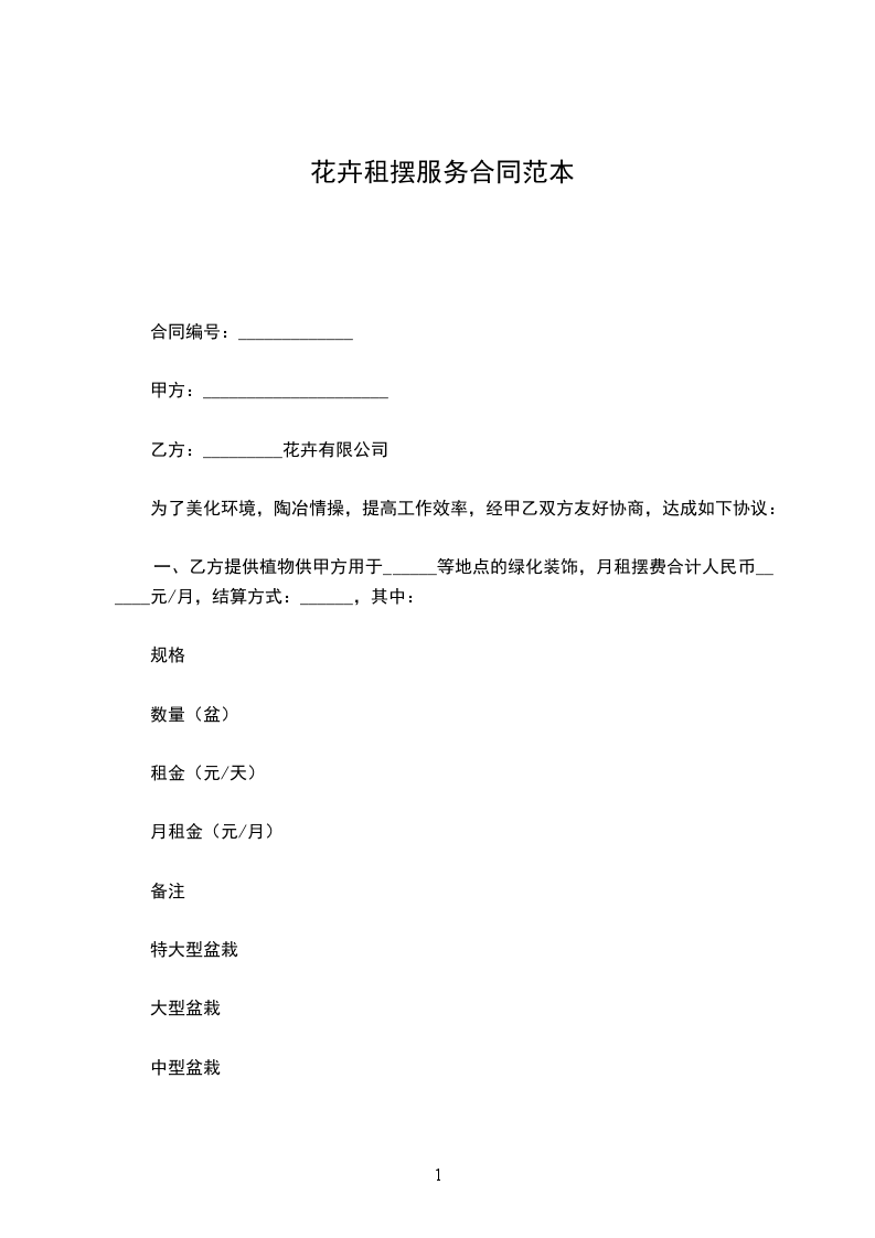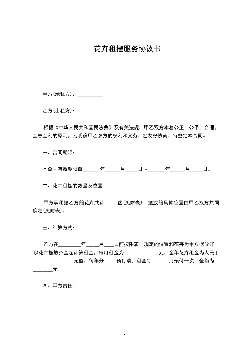 一、乙方提供植物供甲方用于______等地点的绿化装饰,月租摆费合计人民币______元/月,结算方式:______,其中: