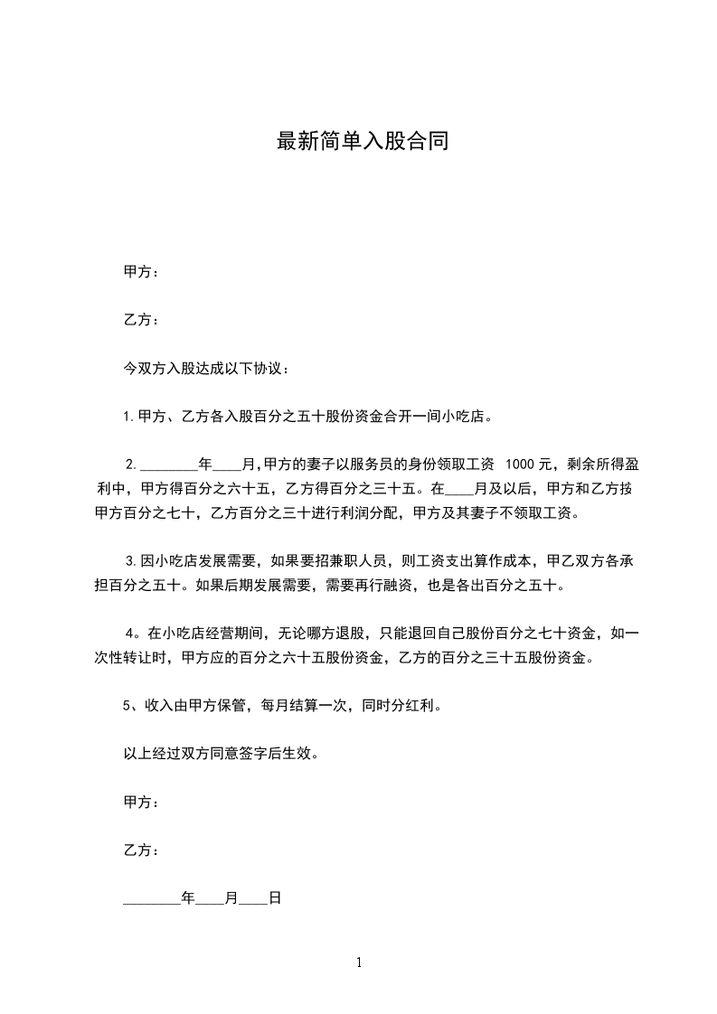 1.甲方、乙方各入股百分之五十股份资金合开一间小吃店。