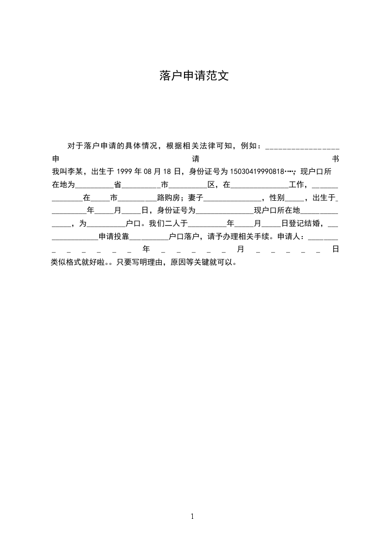 我叫李某,出生于1999年08月18日,身份证号为15030419990818……,现户口所在地为__________省__________市__________区,在_______________工作,_______________在_____市__________路购房;妻子_______________,性别_____,出生于__________年_____月_____日,身份证号为_______________现户口所在地_______________,为__________户口。我们二人于__________年_____月_____日登记结婚,_______________申请投靠__________户口落户,请予办理相关手续。申请人:______________年_____月_____日
