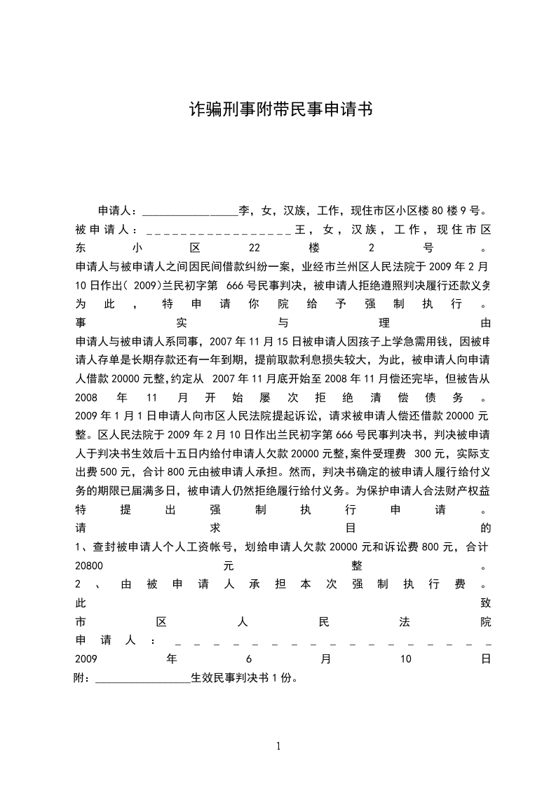 2009年1月1日申请人向市区人民法院提起诉讼,请求被申请人偿还借款20000元整。区人民法院于2009年2月10日作出兰民初字第666号民事判决书,判决被申请人于判决书生效后十五日内给付申请人欠款20000元整,案件受理费300元,实际支出费500元,合计800元由被申请人承担。然而,判决书确定的被申请人履行给付义务的期限已届满多日,被申请人仍然拒绝履行给付义务。为保护申请人合法财产权益,特提出强制执行申请。